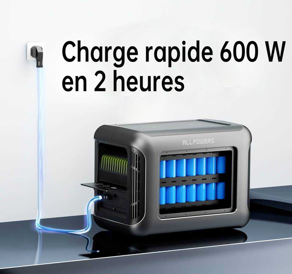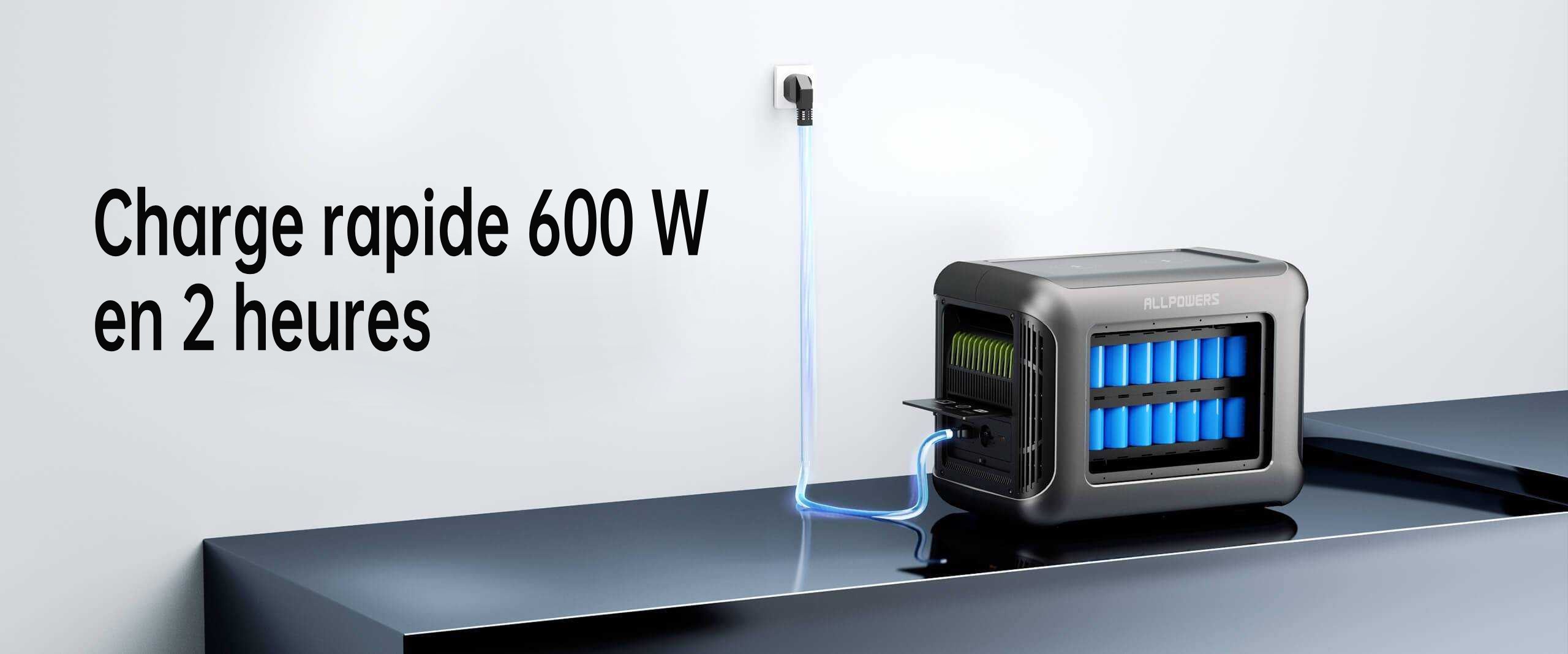 Entrée haute tension CA 600 W, charge complète de 0 à 100 % en 2 heures ;