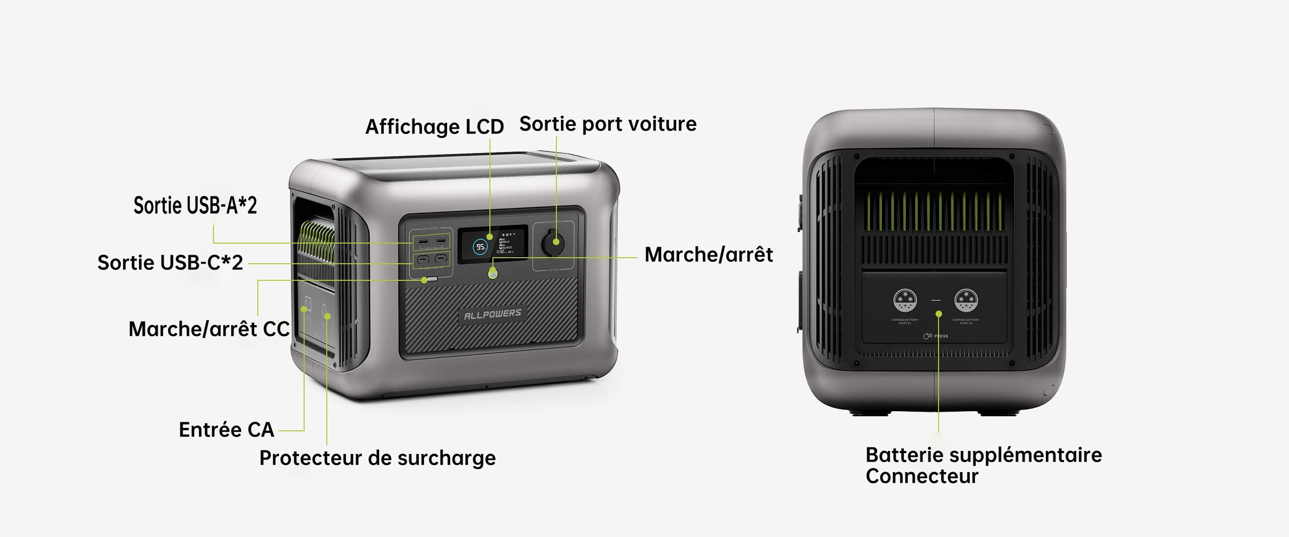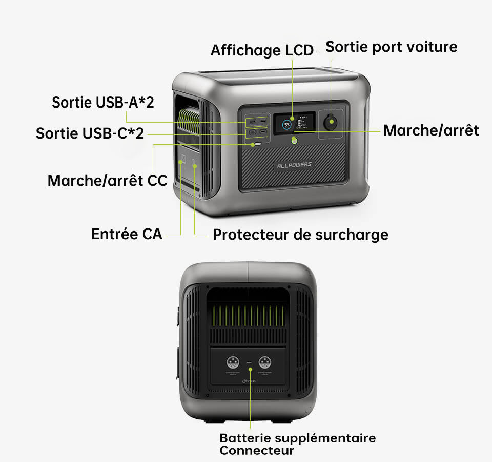 - Centrale électrique autonome avec port USB-C, port voiture 12 V/10 A et port USB-A ;