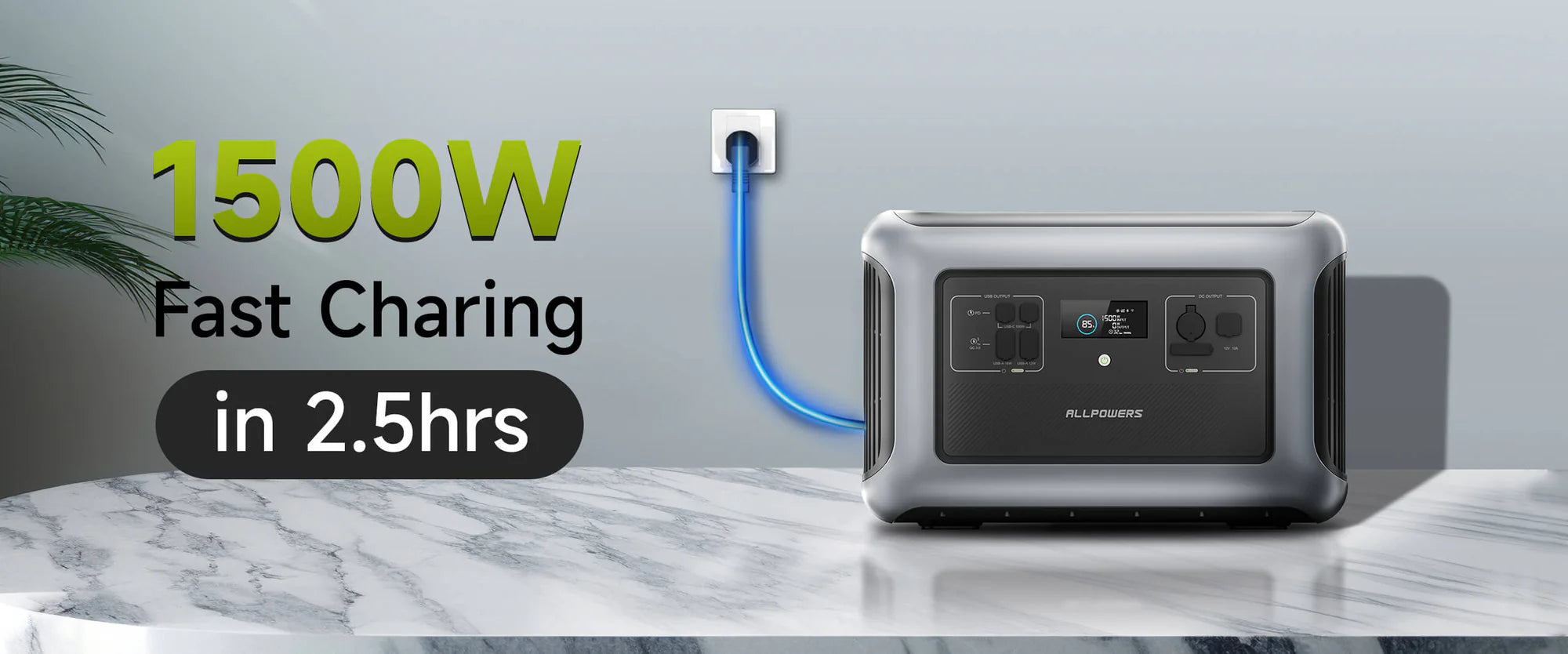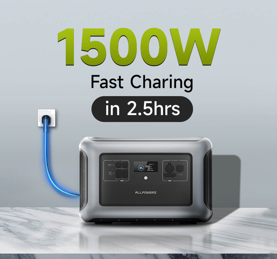 Entrée haute tension CA 1500 W, charge complète de 0 à 100 % en 2,5 heures ;