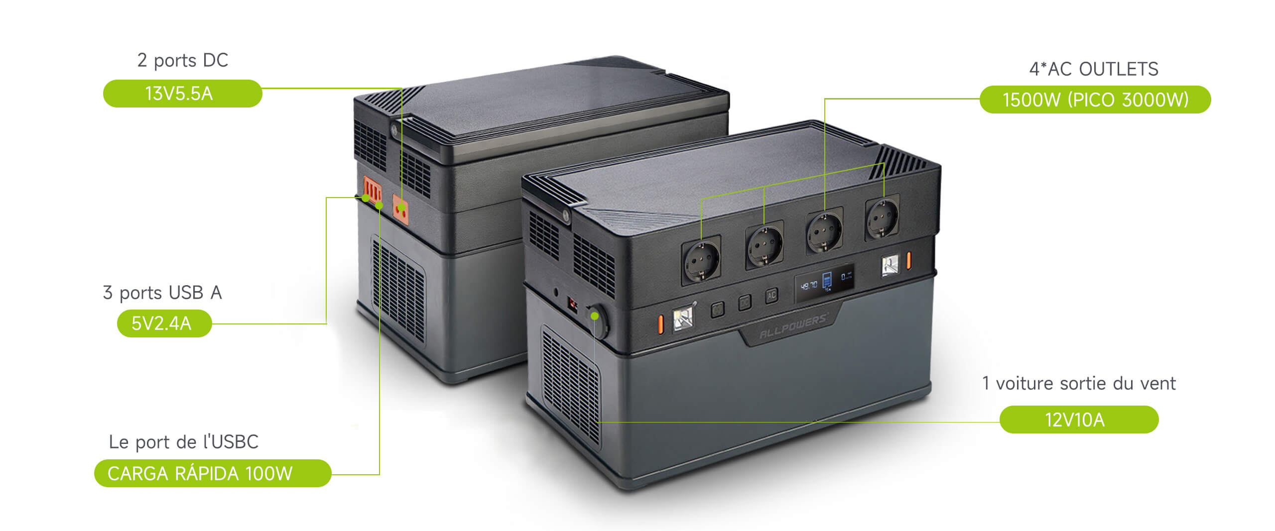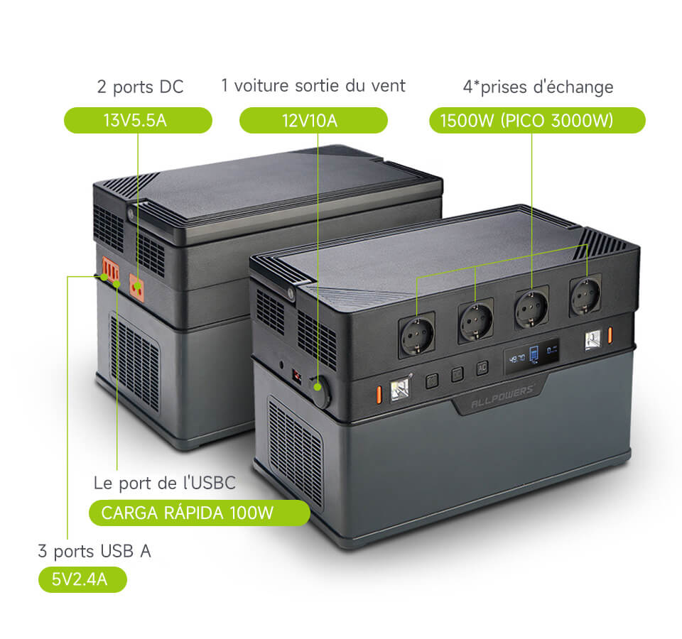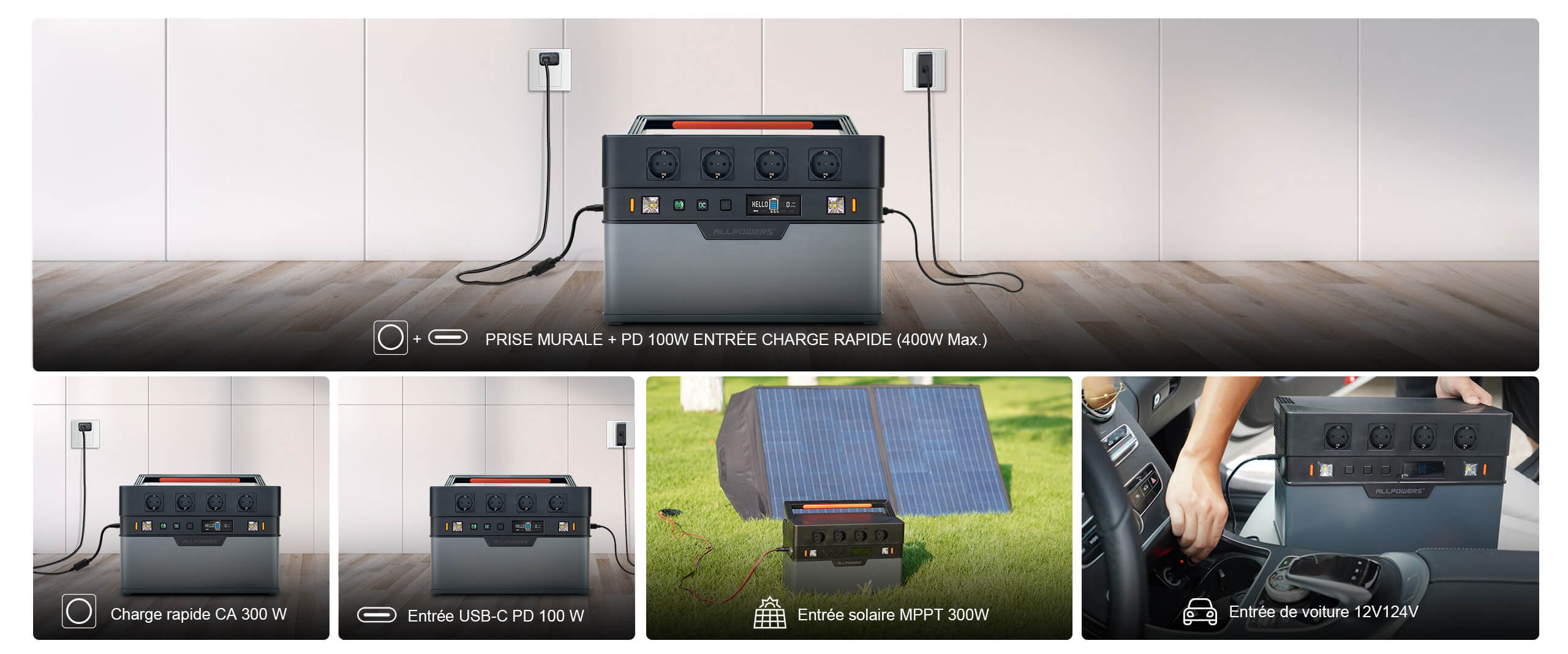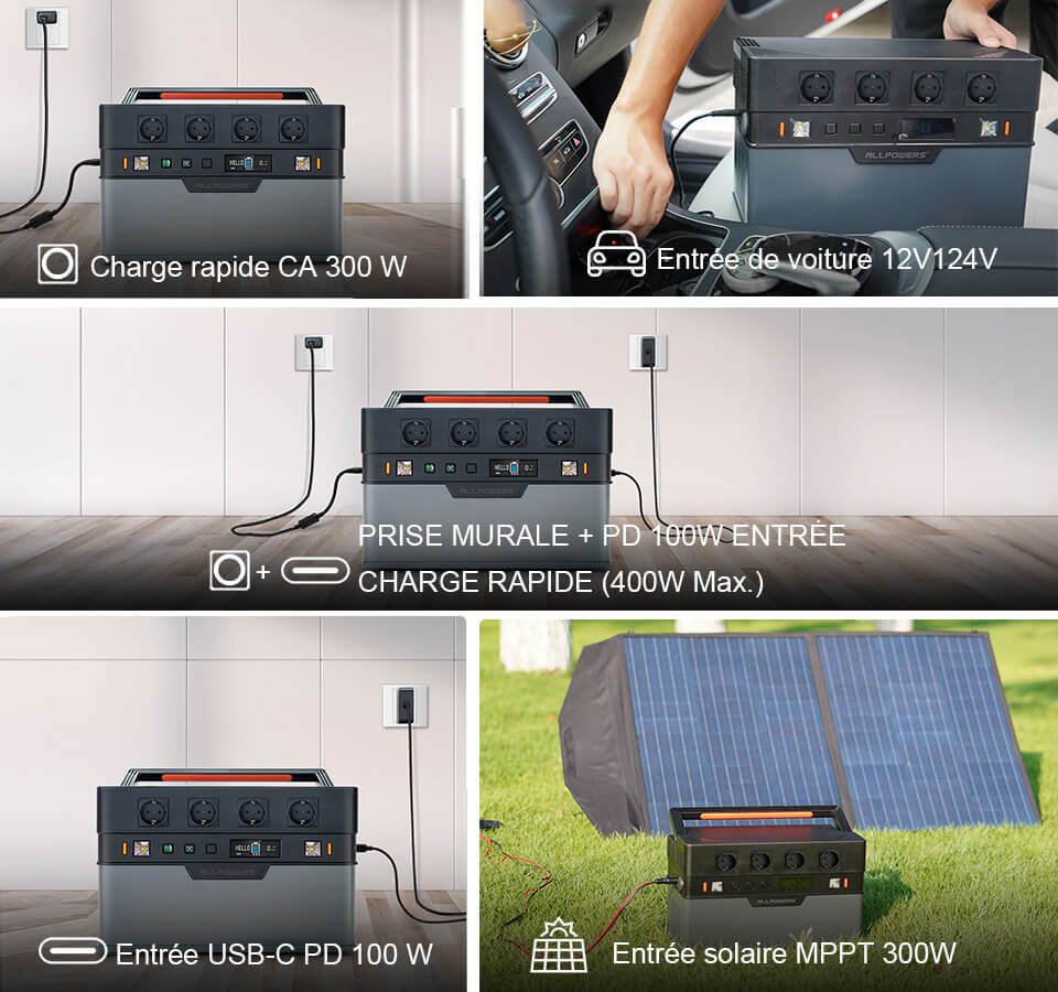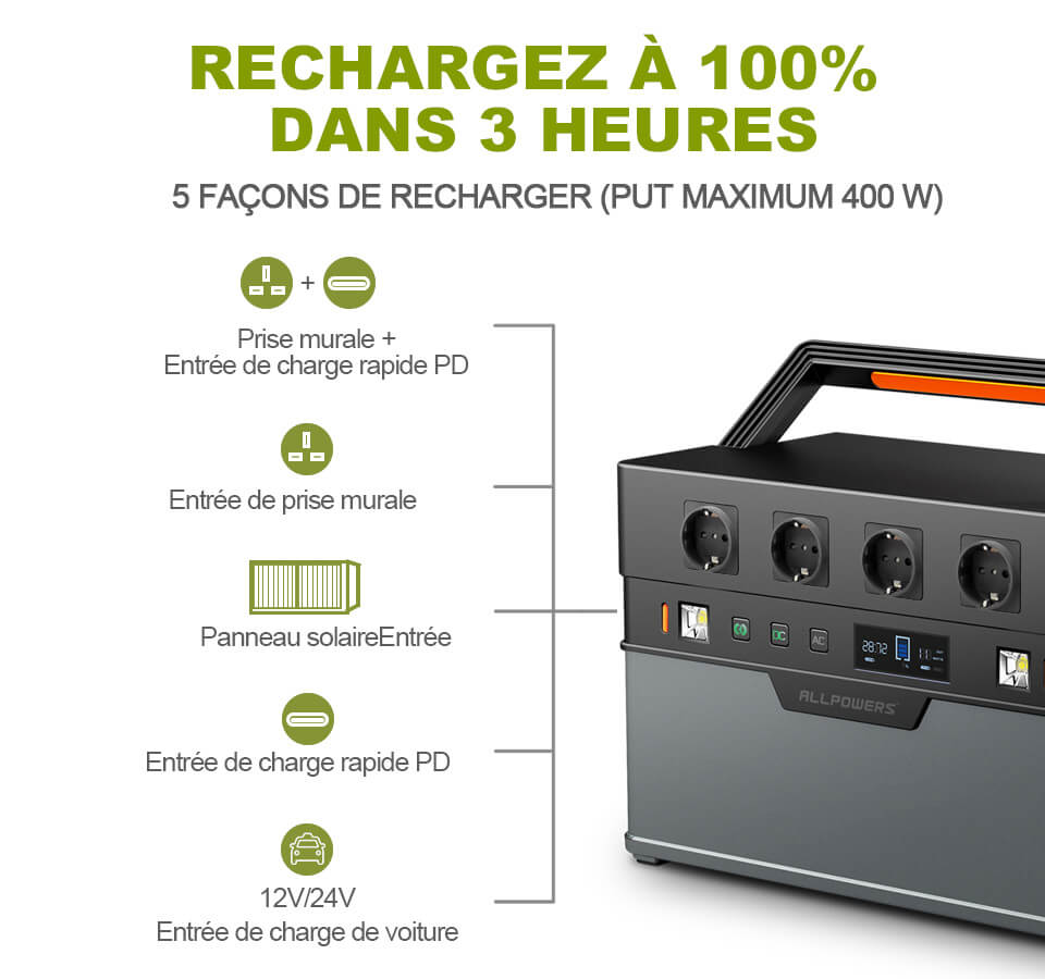 - 6 façons de recharger (AC/USB-C/AC+USB-C/solaire/voiture/solaire+USB-C) ;