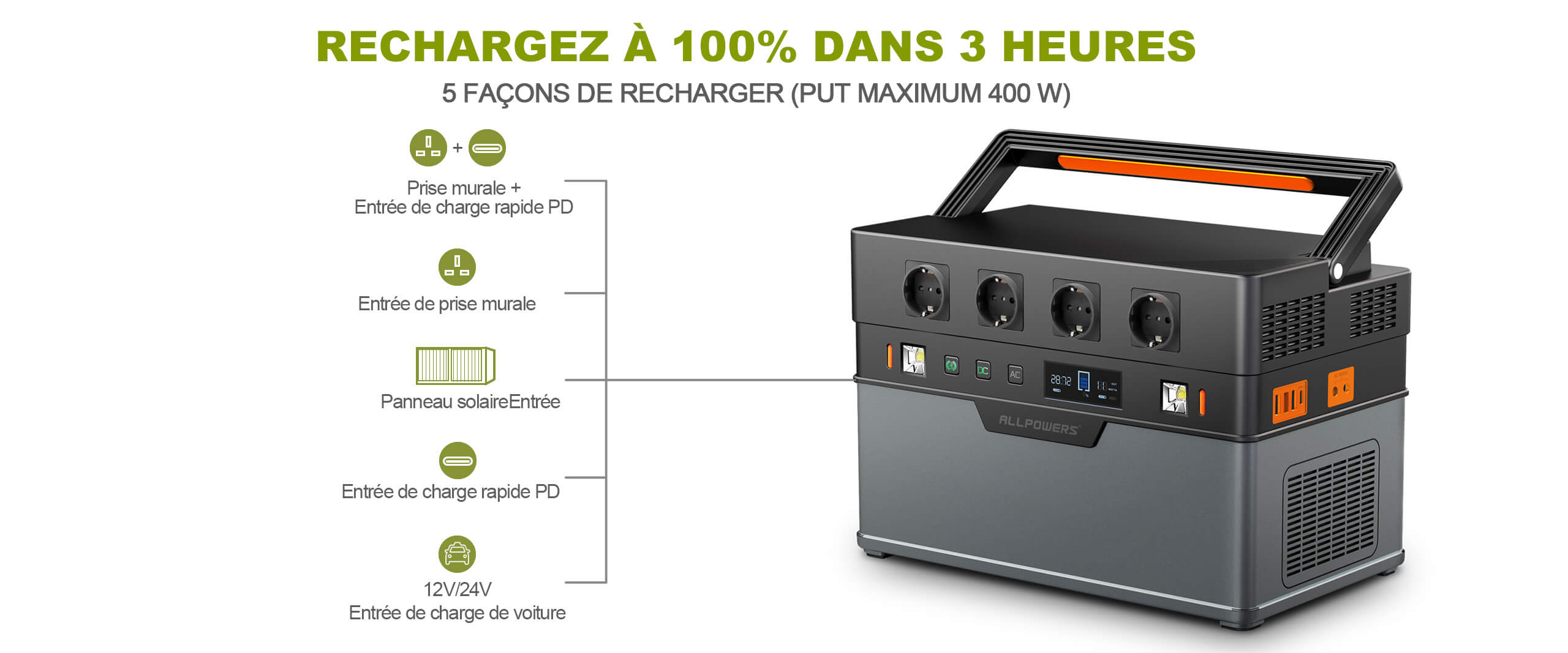 Chargeur mural/chargeur de voiture/charge de panneau solaire (entrée 300W) : 3h-4hCharge type-c (entrée 100W) : 9h-10hChargeur mural+ charge type-c (400W) : 2h-3h"