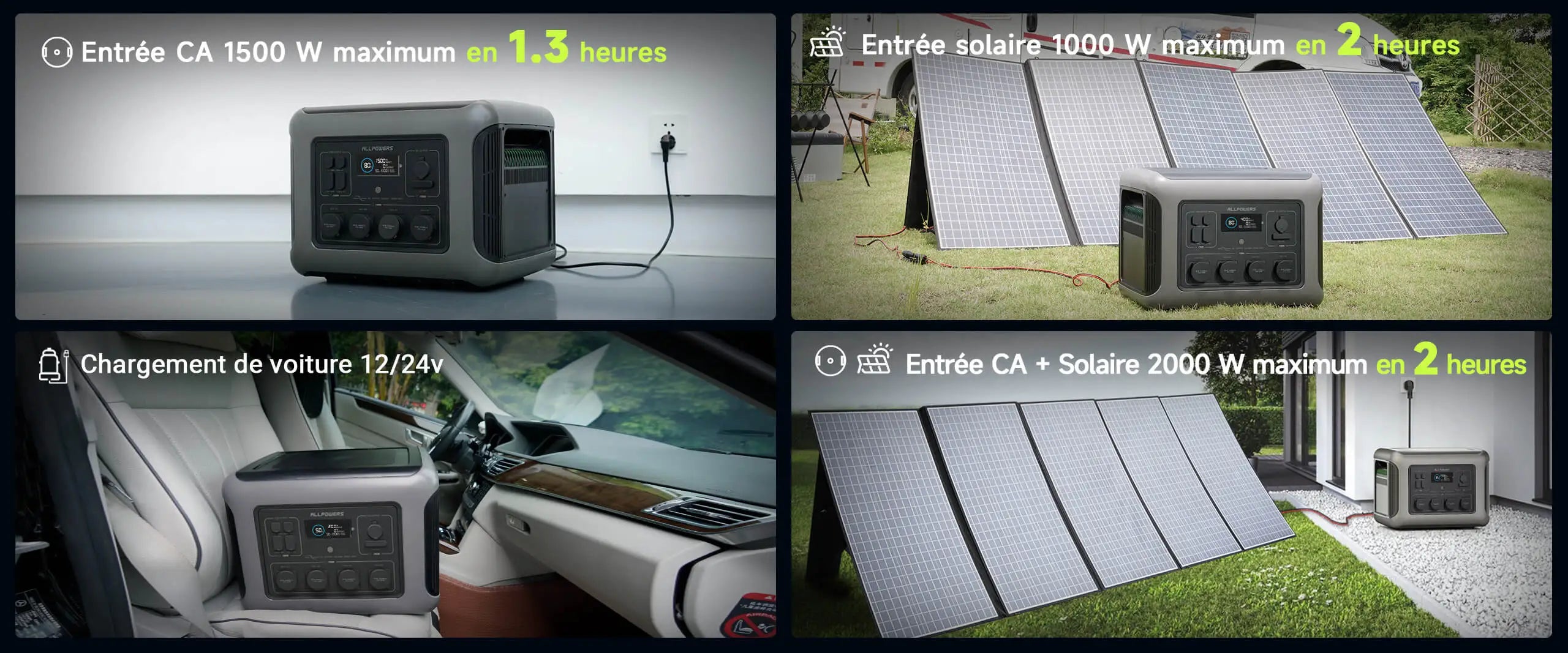 - 5 façons de charger (AC/solaire/auto/générateur/double AC+solaire) ;