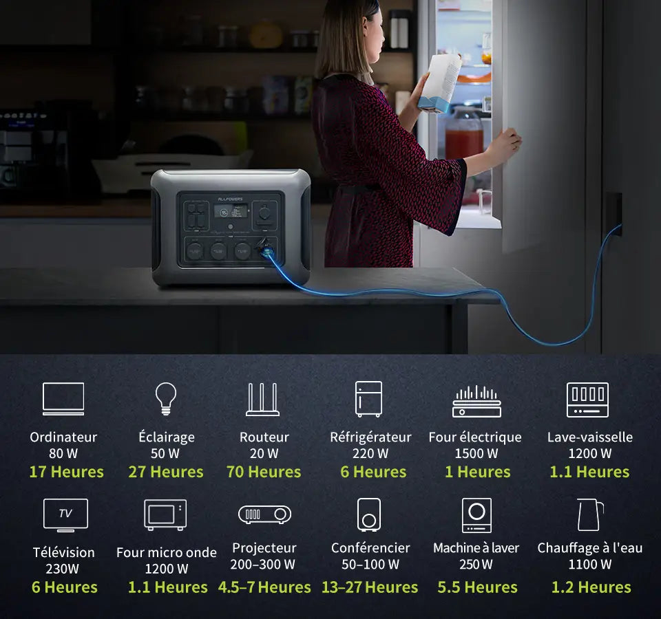 Bénéficiez de performances inégalées avec sa capacité massive de 1920Wh et sa puissante sortie CA de 2500 W (4000 W en crête). Cette puissante centrale électrique est prête à fournir une alimentation de secours fiable pour votre maison. Qu'il s'agisse d'une nuit d'orage ou d'un entretien programmé, le R2500 a ce dont vous avez besoin. Gardez les lumières allumées, vos appareils fonctionnent et vos appareils se chargent.