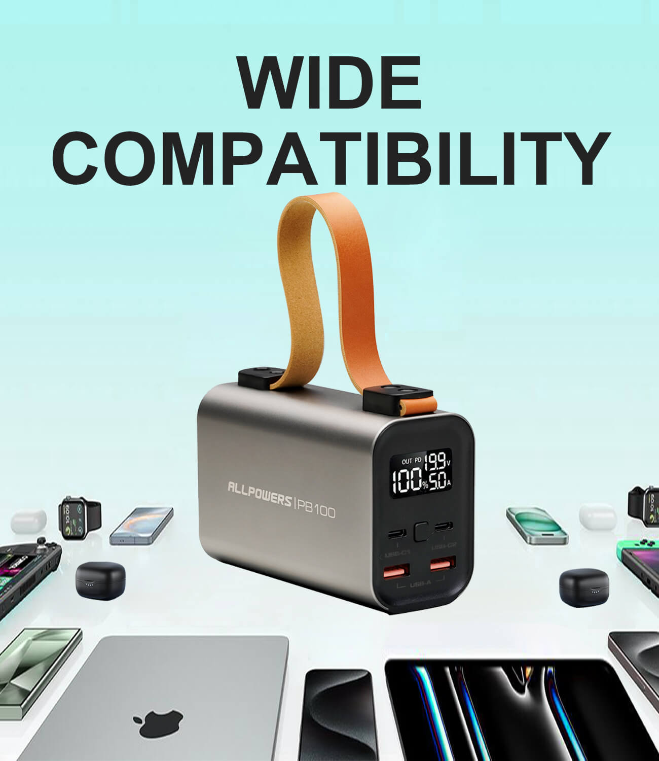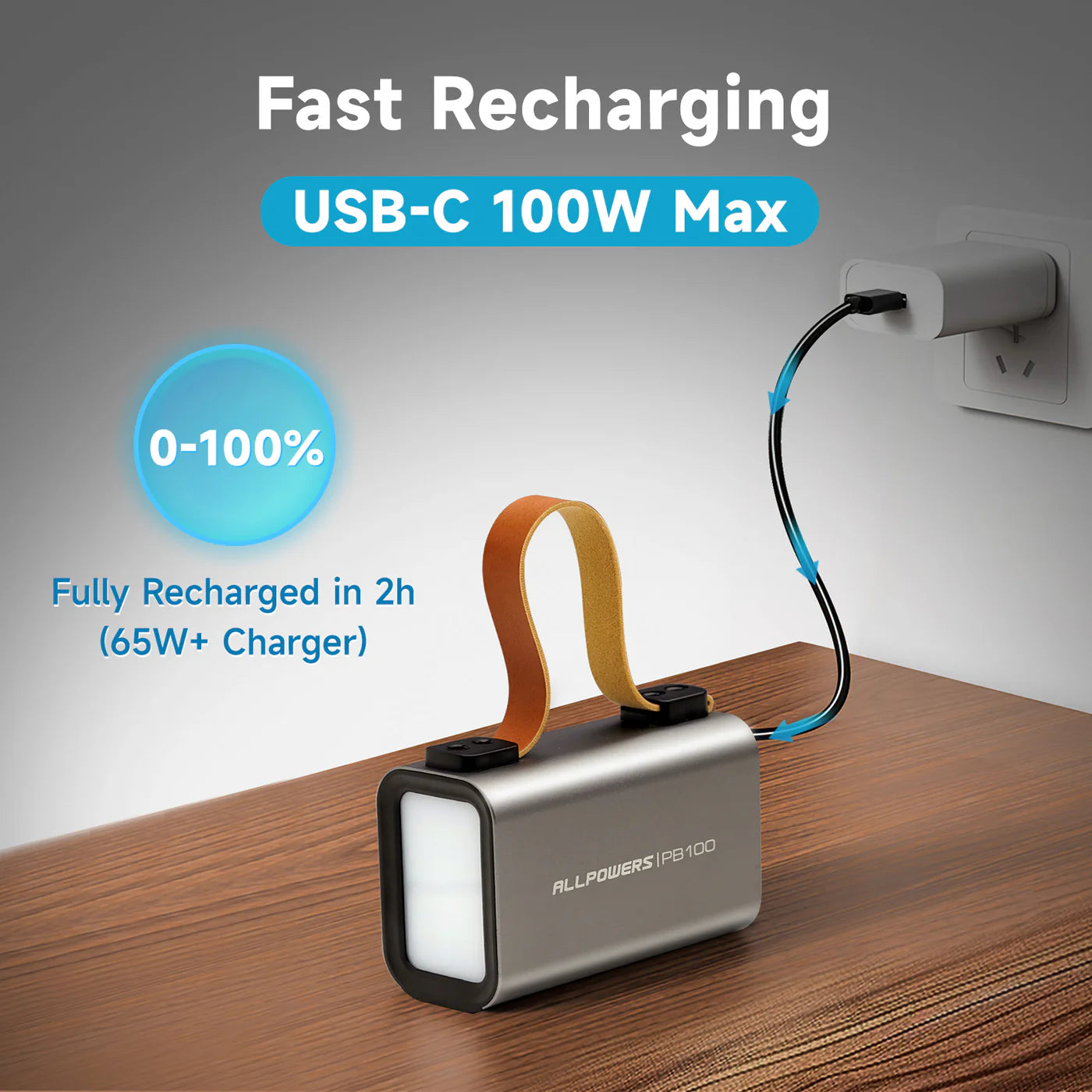 Il prend en charge le protocole PD3.0 et fournit jusqu'à 100 W de puissance de sortie via le port USB-C. Chargez votre ordinateur portable, tablette, téléphone portable ou autres appareils à plus de 50 % en seulement 30 minutes. Il prend également en charge jusqu'à 65 W d'alimentation d'entrée et peut être complètement chargé en 2 heures (en utilisant des chargeurs 65 W+).
