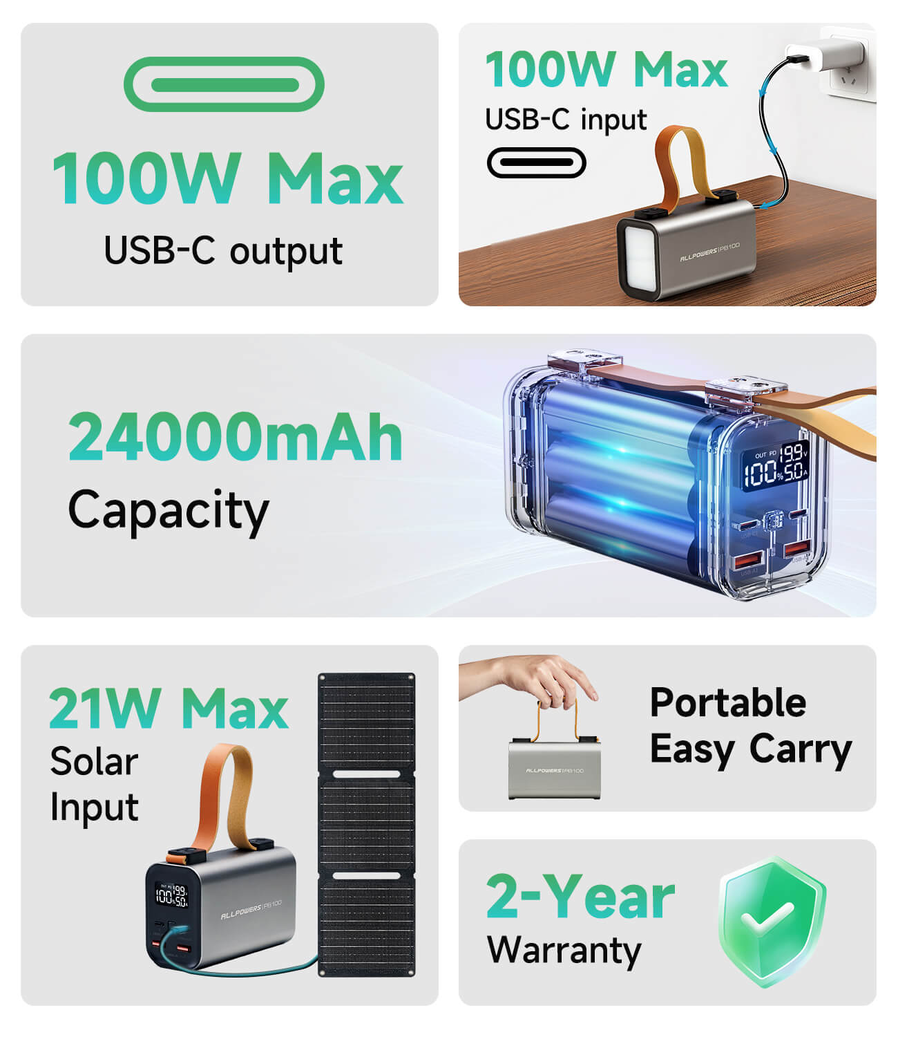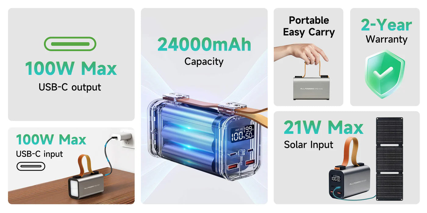 La banque d'alimentation portable ALLPOWERS PB100 100w peut charger votre téléphone portable plus de 3 fois. répond aux besoins d'autonomie de la batterie de vos multiples produits électroniques.