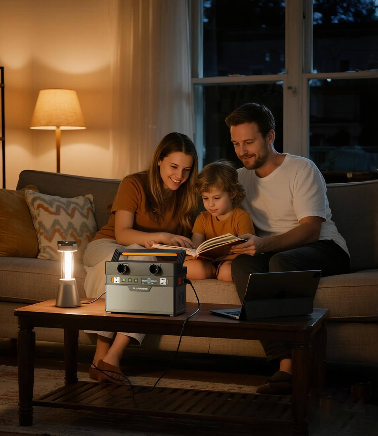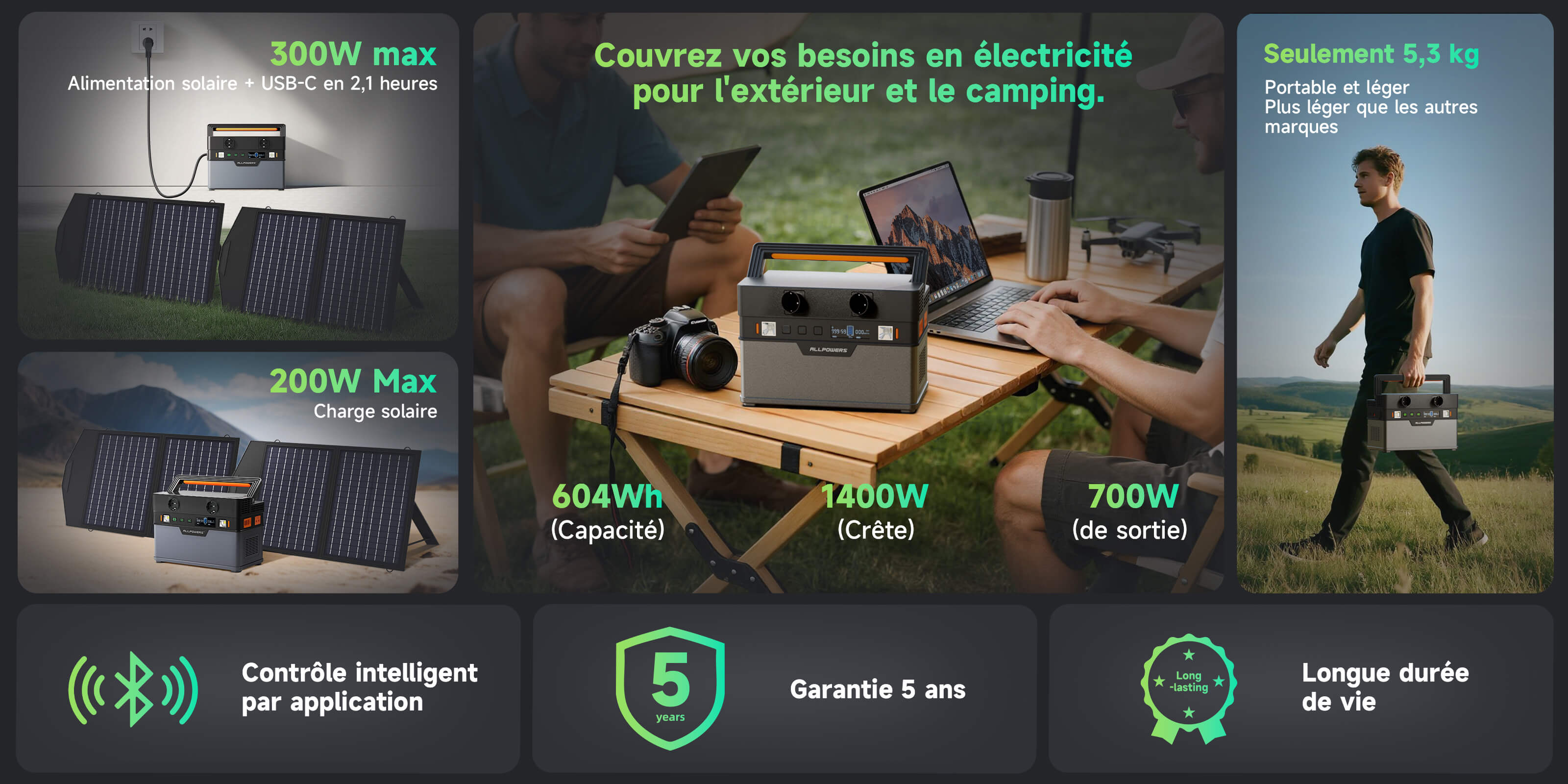 La station d'alimentation ALLPOWERS S700 offre 604 Wh pour un poids léger de 5,3 kg. Son format compact et sa poignée de transport en font une station d'alimentation mobile idéale pour le camping. Avec une capacité de 604 Wh et une puissance nominale de 700 W, elle peut alimenter de nombreux appareils, comme une mini-glacière, un ventilateur, un projecteur, une lampe ou un téléviseur, pendant une longue durée. La lampe intégrée peut servir d'éclairage de secours.