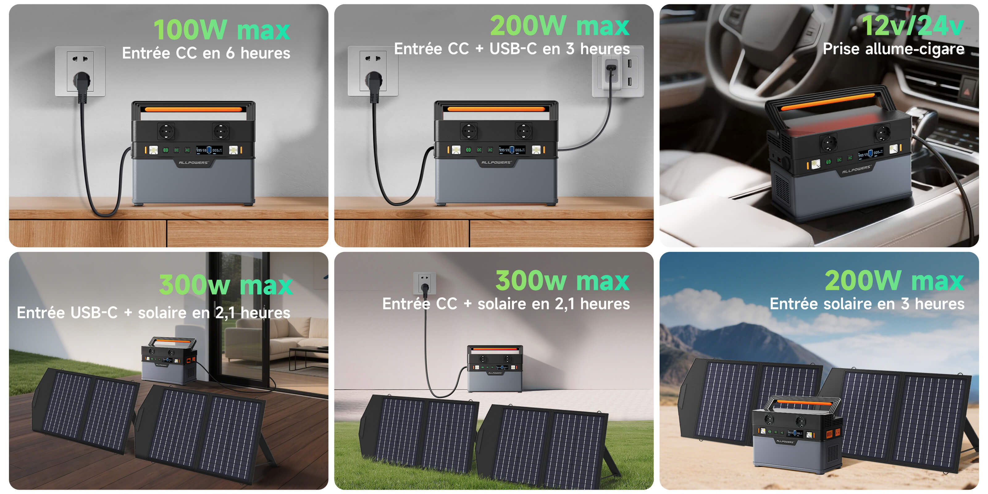 - Plusieurs méthodes de charge (DC/USB-C/DC+USB-C/entrée solaire/entrée allume-cigare/entrée solaire+USB-C ou DC) ;