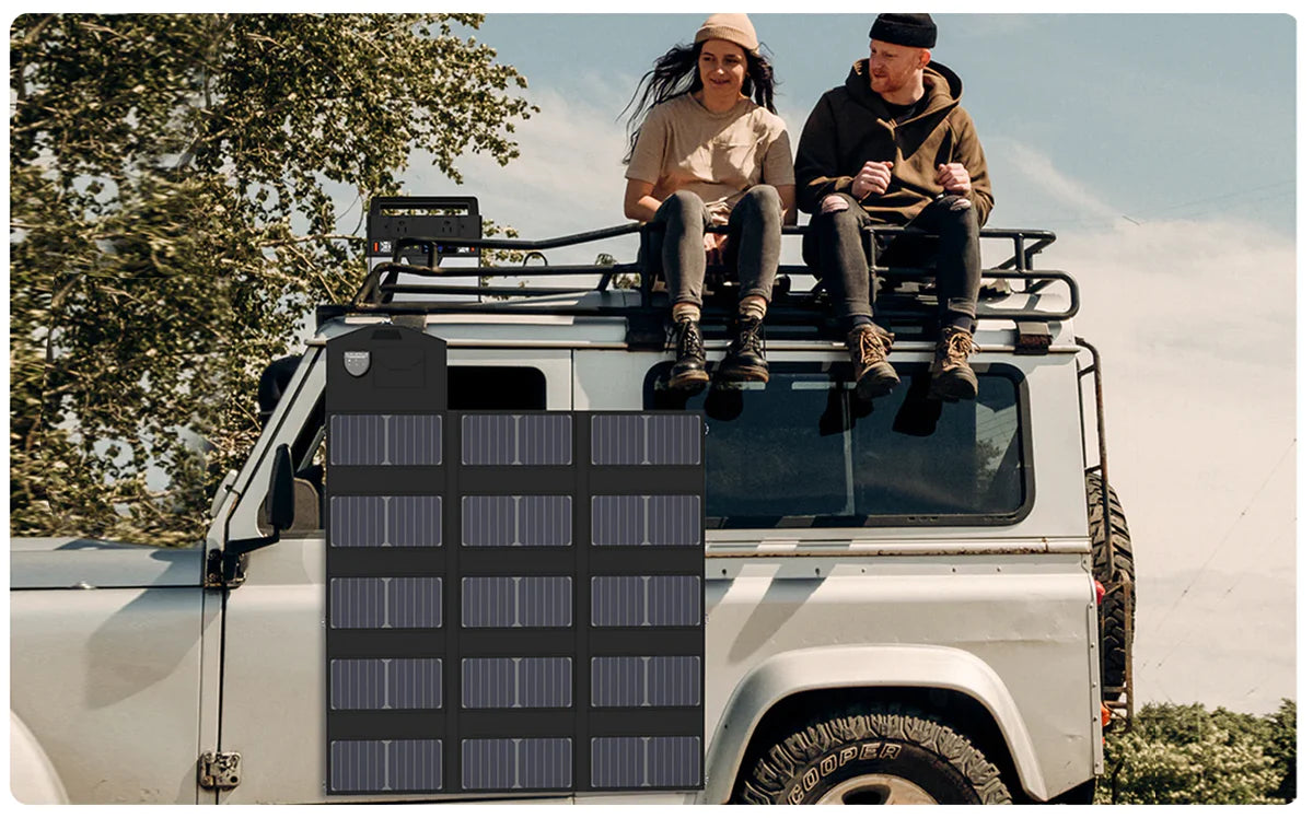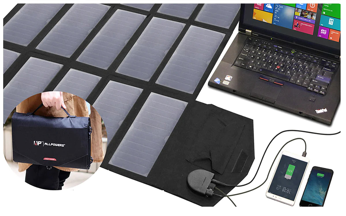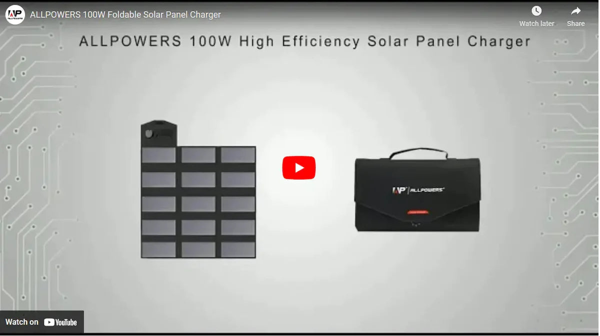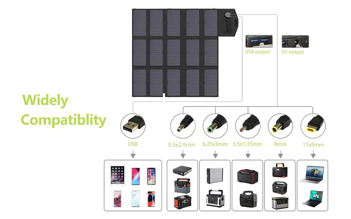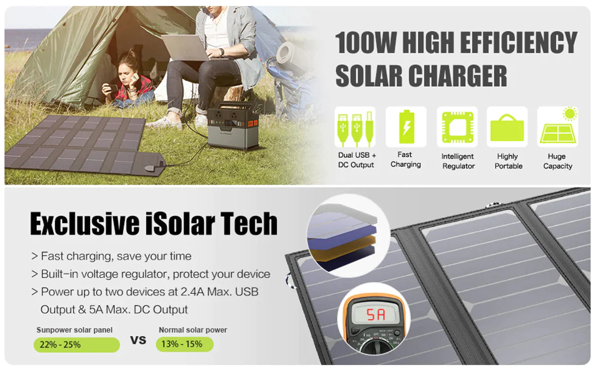 Équipé d'une double sortie USB, le panneau solaire de 100 W est hautement compatible avec les téléphones, iPads et autres appareils. Vous pouvez également connecter la centrale électrique portable ALLPOWERS S200/S300/S700.