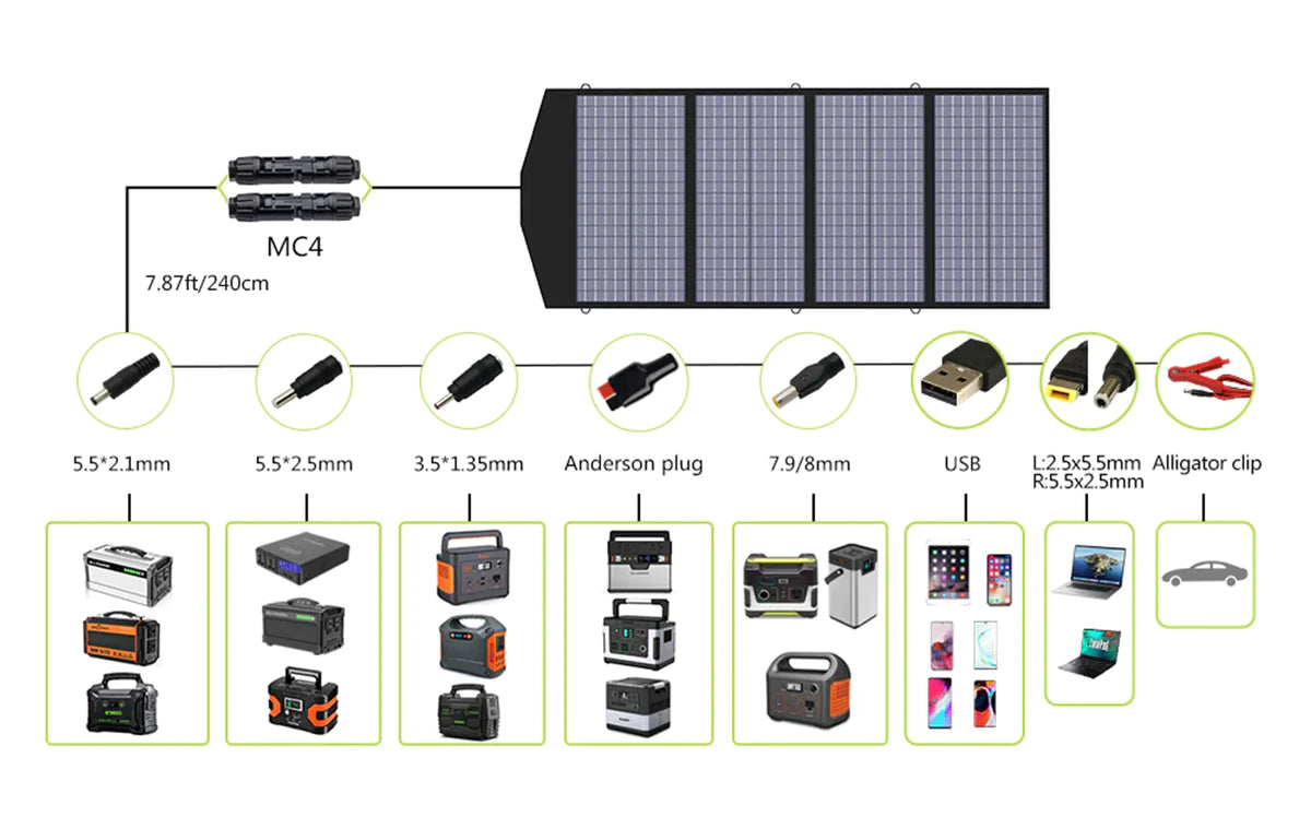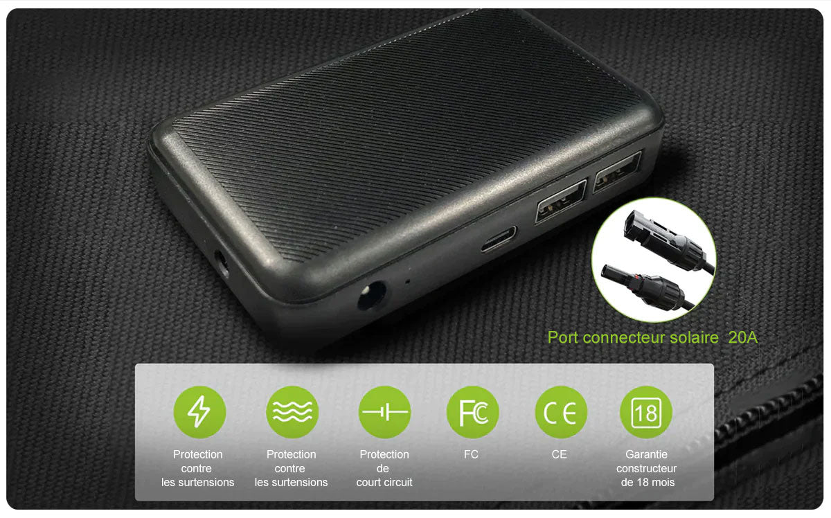 La sortie connecteur solaire peut fournir un courant de 25 A (max) tandis que le port CC ne transporte que 10 A, un double port USB (5 V/2,4 A par port) pour charger vos gadgets alimentés par 5 V et une sortie 18 V CC (18 V/3 A) pour charger votre ordinateur portable. ou batterie de voiture 12 V et générateur portable, le port de connexion parallèle de la boîte de jonction pour connecter plusieurs panneaux solaires pliables.