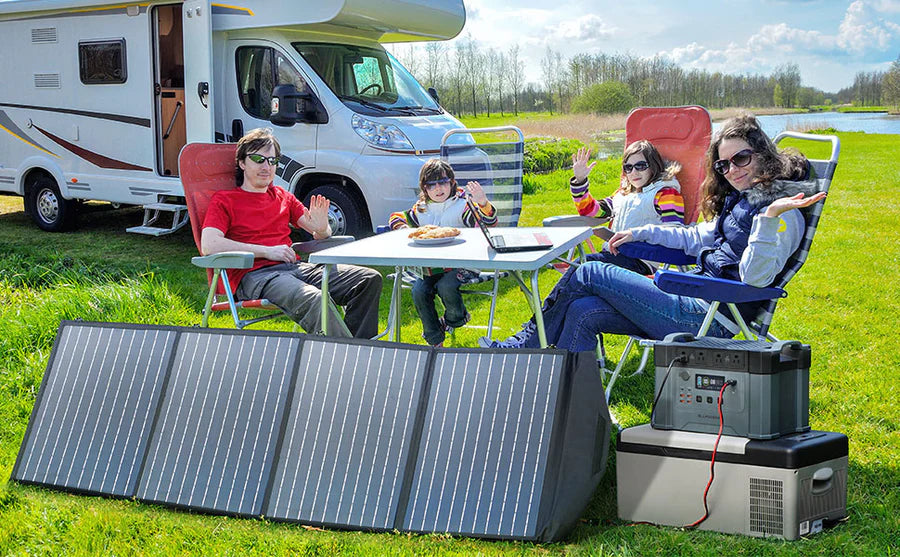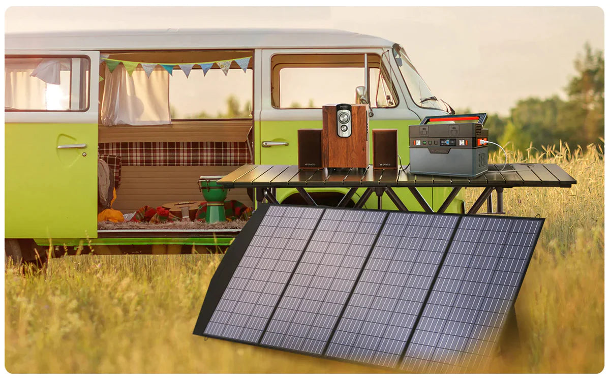 Panneau solaire portable ALLPOWERS 200 W jusqu'à 22 % d'efficacité et 1/3 plus léger que la même puissance du silicium solaire. La sortie de 200 W peut fournir plus de puissance à vos appareils et les charger plus rapidement.