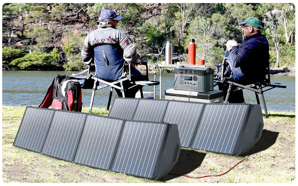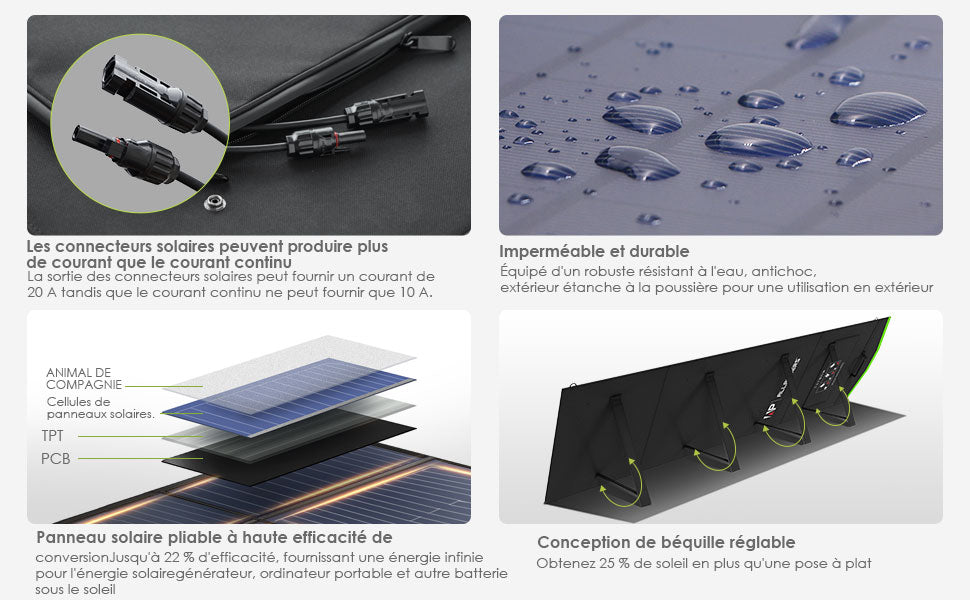 Le panneau solaire pliable de 200 W est construit en nylon IP66 durable et étanche et avec support réglable. Il peut aider vos appareils à recevoir la lumière du soleil la plus efficace en toute sécurité.