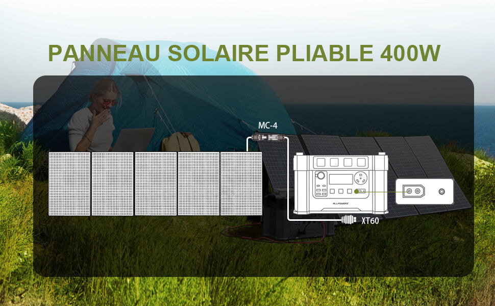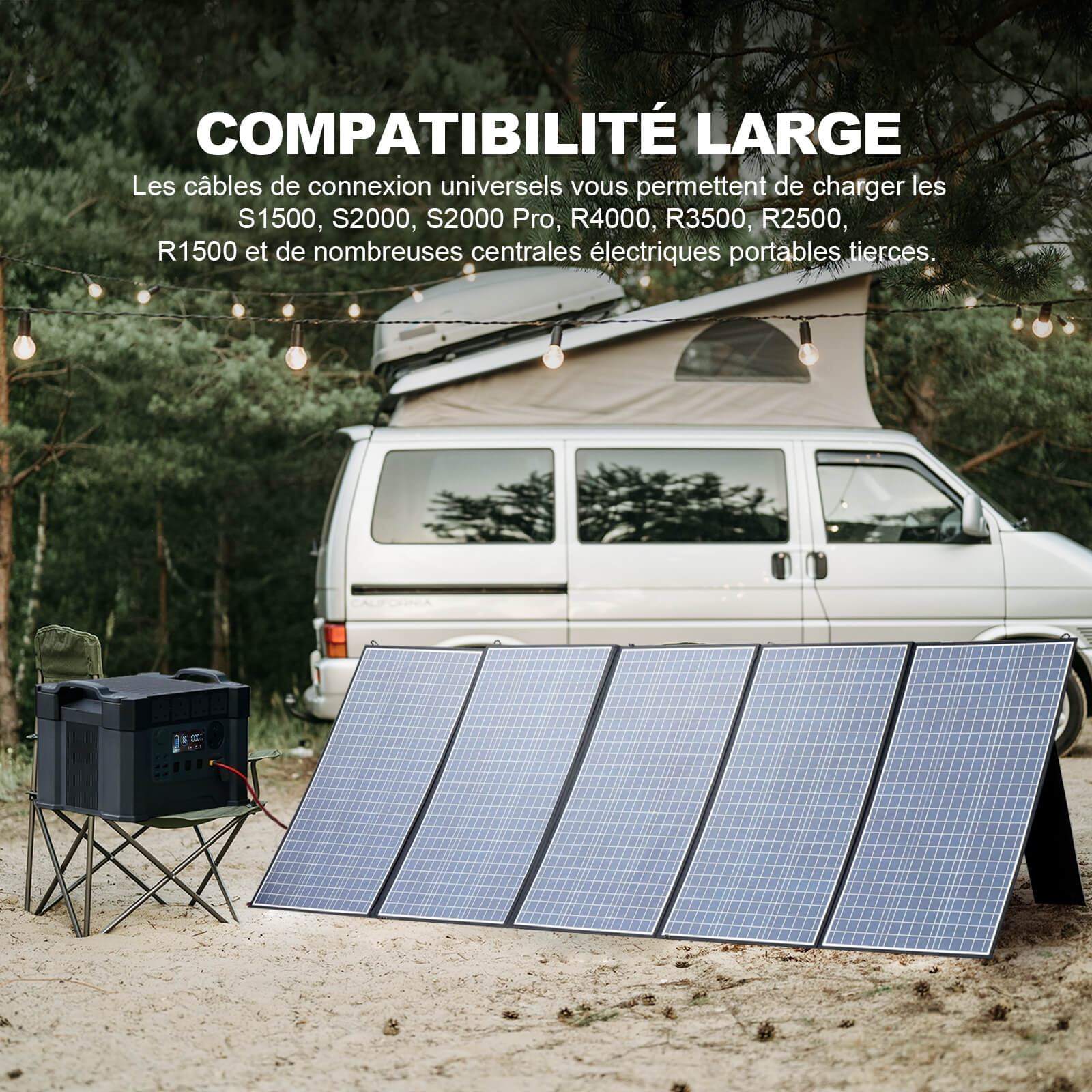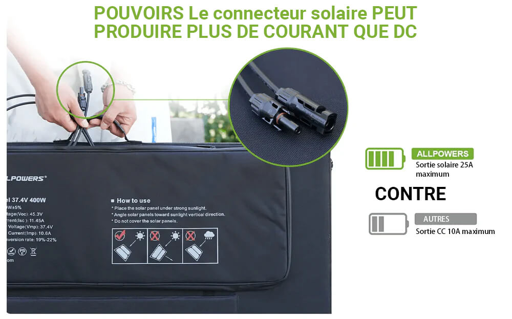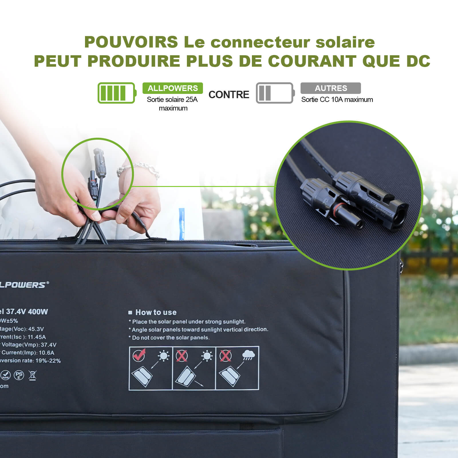 Avec les ports de sortie connecteur solaire, le panneau solaire ALLPOWERS 400 W fournit une puissance énorme de 37,4 V pour vos générateurs solaires, tels que ALLPOWRS S2000/S2000 Pro /R4000/R3500/R2500/R1500 et d'autres grands générateurs sur le marché. Réduisez efficacement le temps de charge et profitez de l'énergie solaire dès que possible.