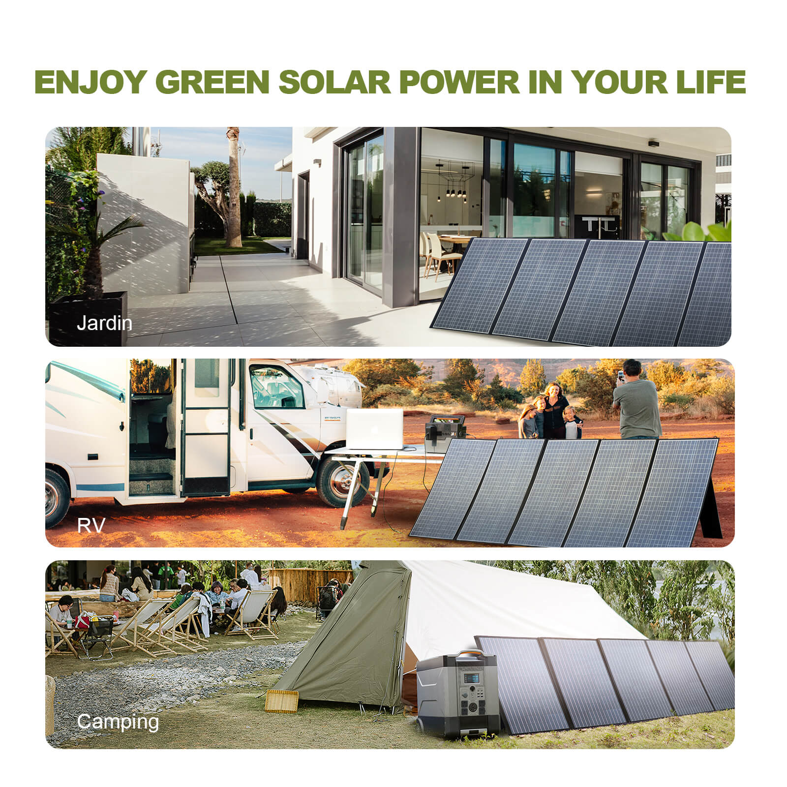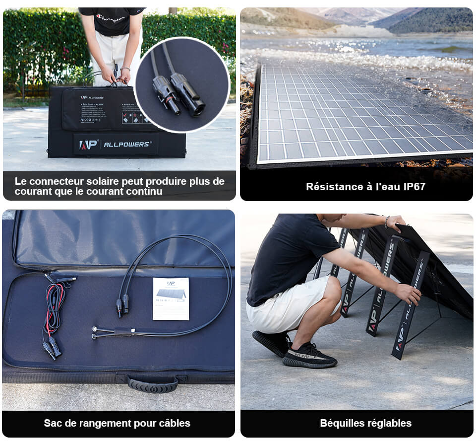 Le panneau solaire pliable ALLPOWERS 400W a un rendement de conversion élevé, qui peut atteindre 22 %. Le panneau solaire portable de 400 W génère plus d'énergie et fonctionne mieux que les panneaux solaires conventionnels par tous les temps, même par temps nuageux ou froid.