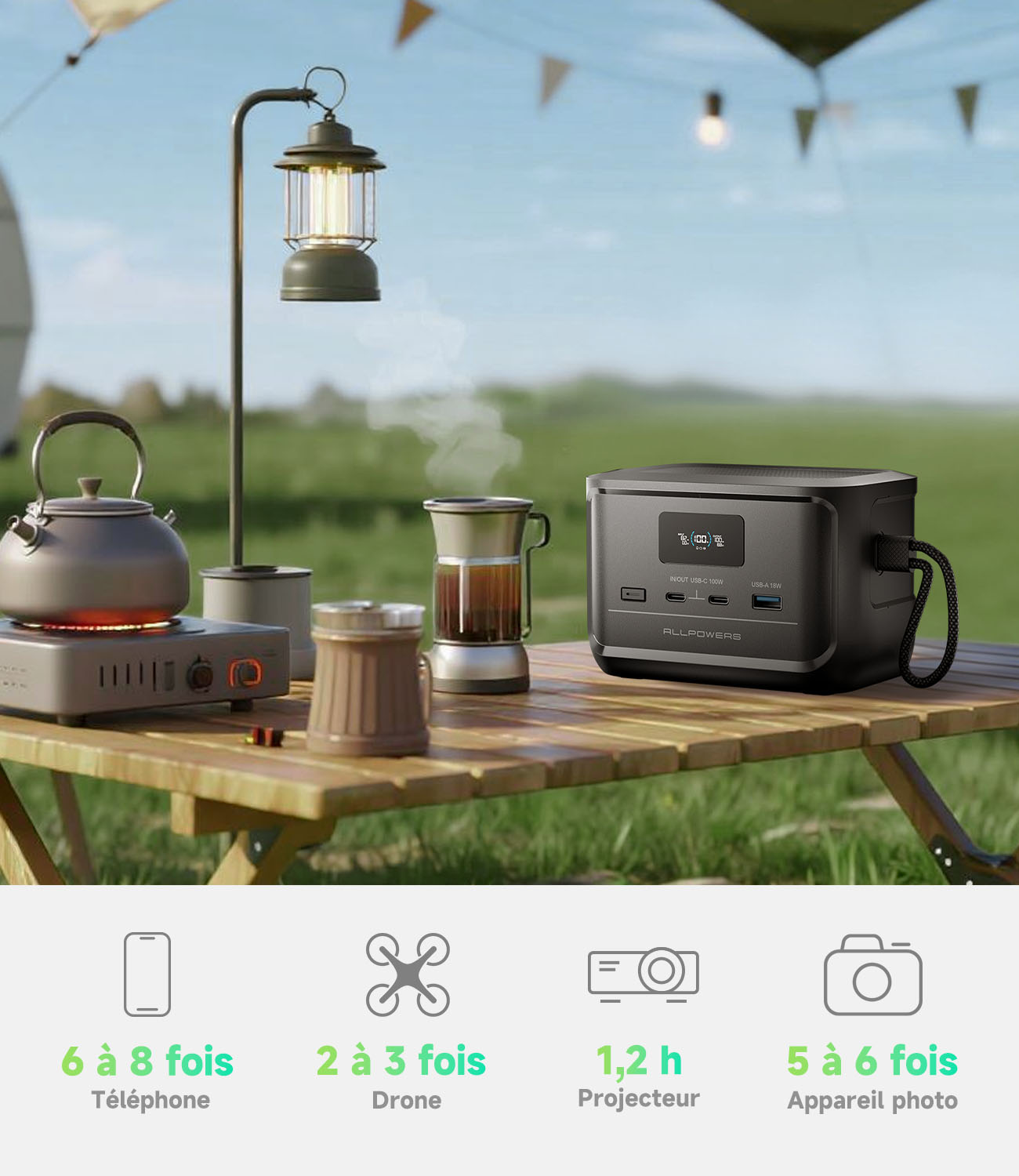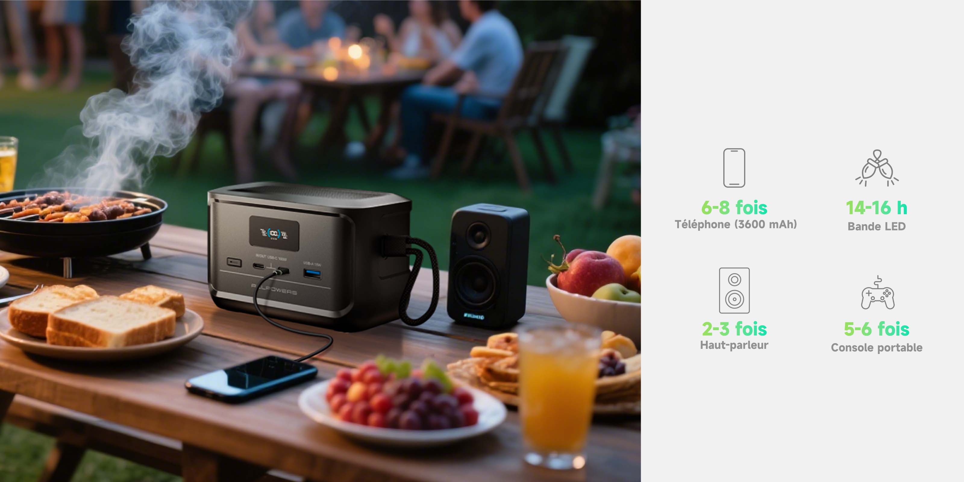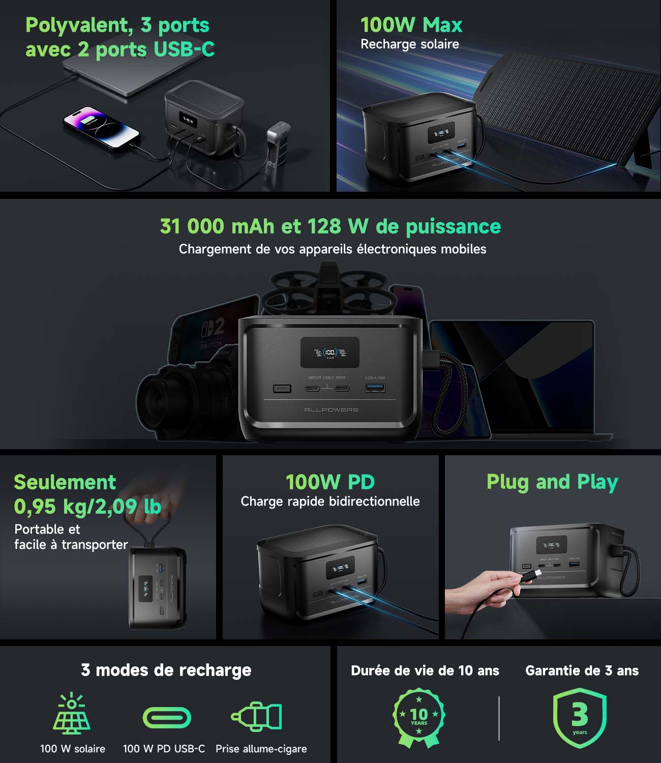 - Alimentez tous vos appareils électroniques où que vous soyez avec polyvalence, silence absolu et zéro émission ;