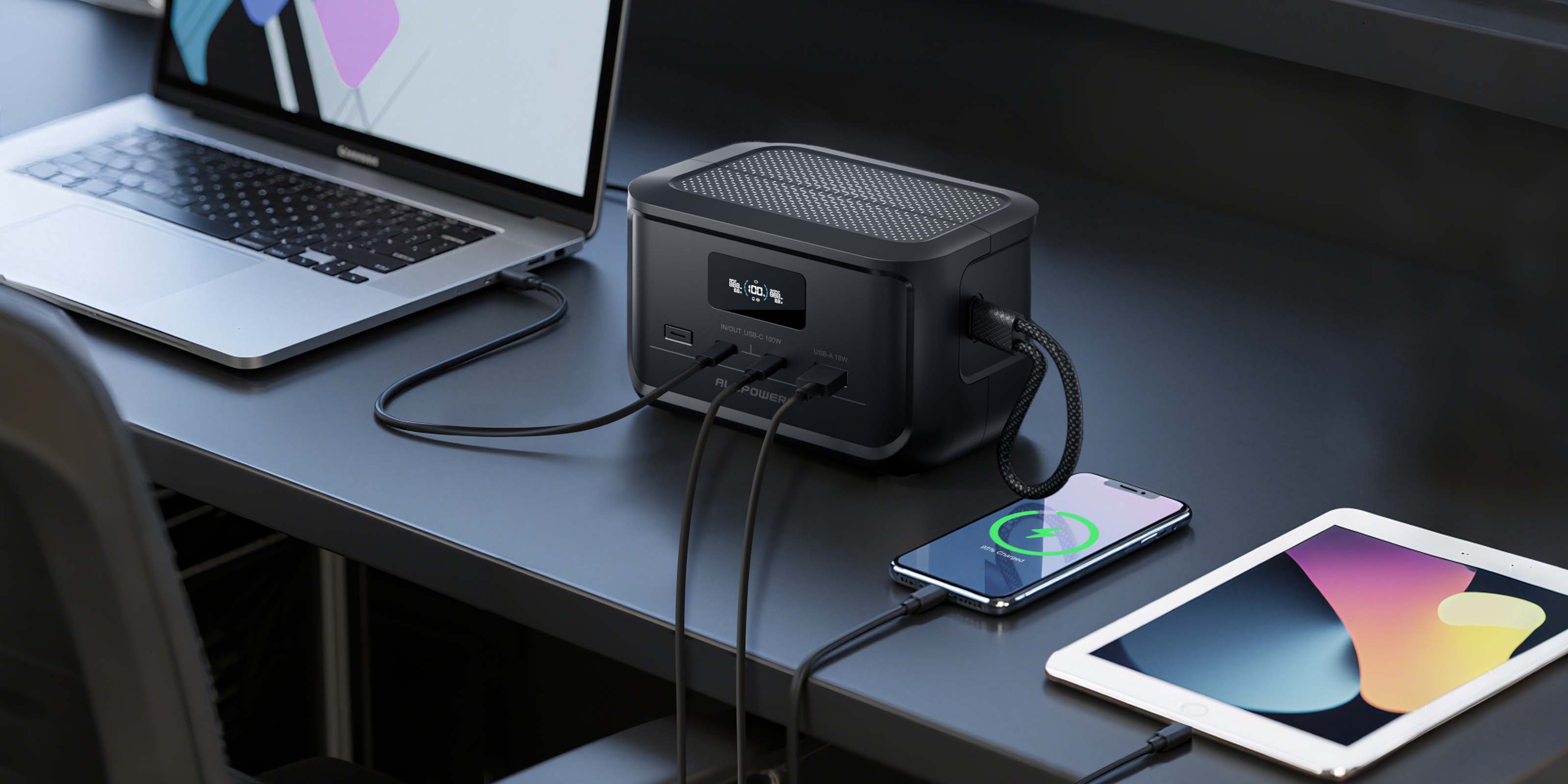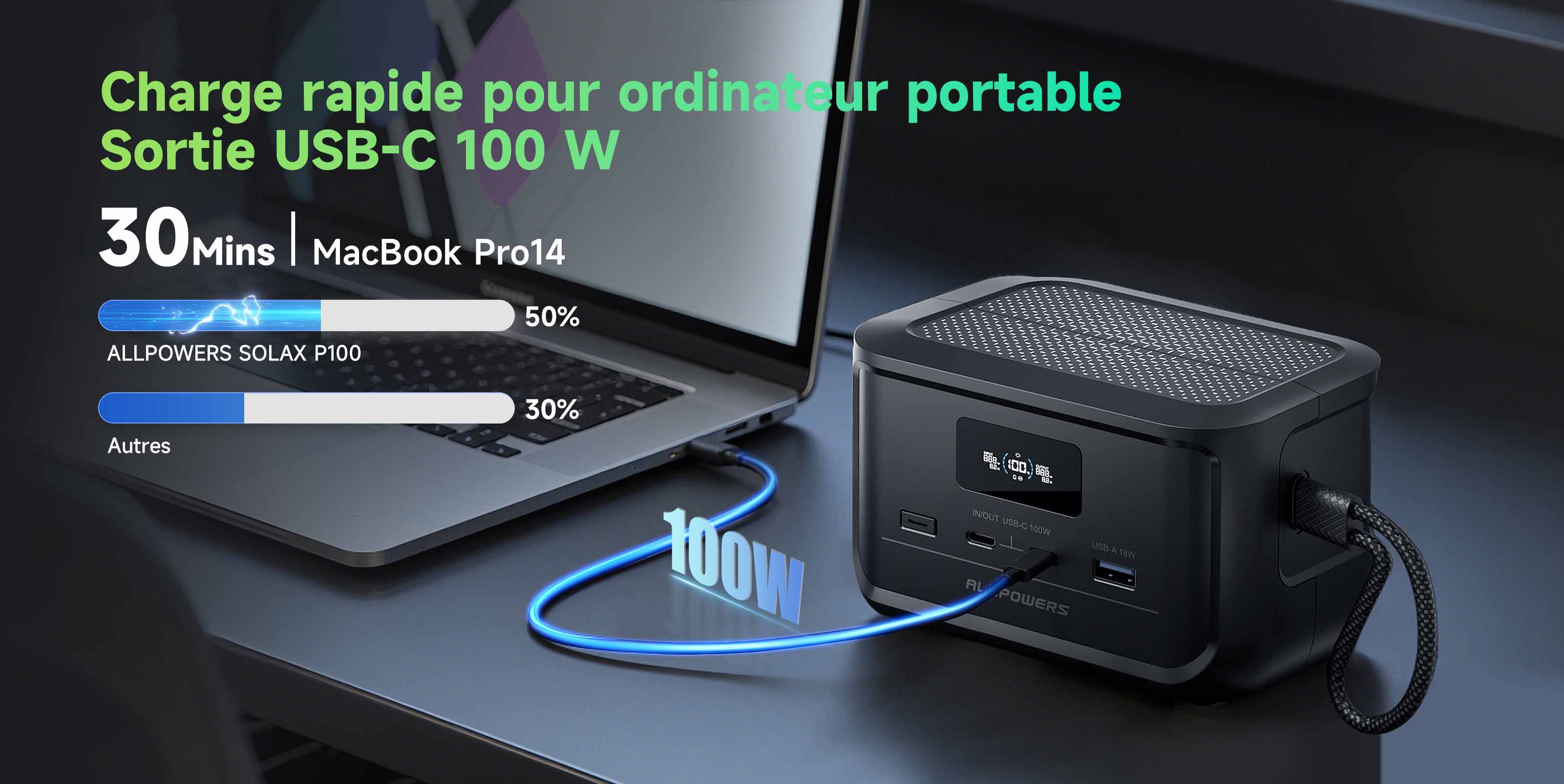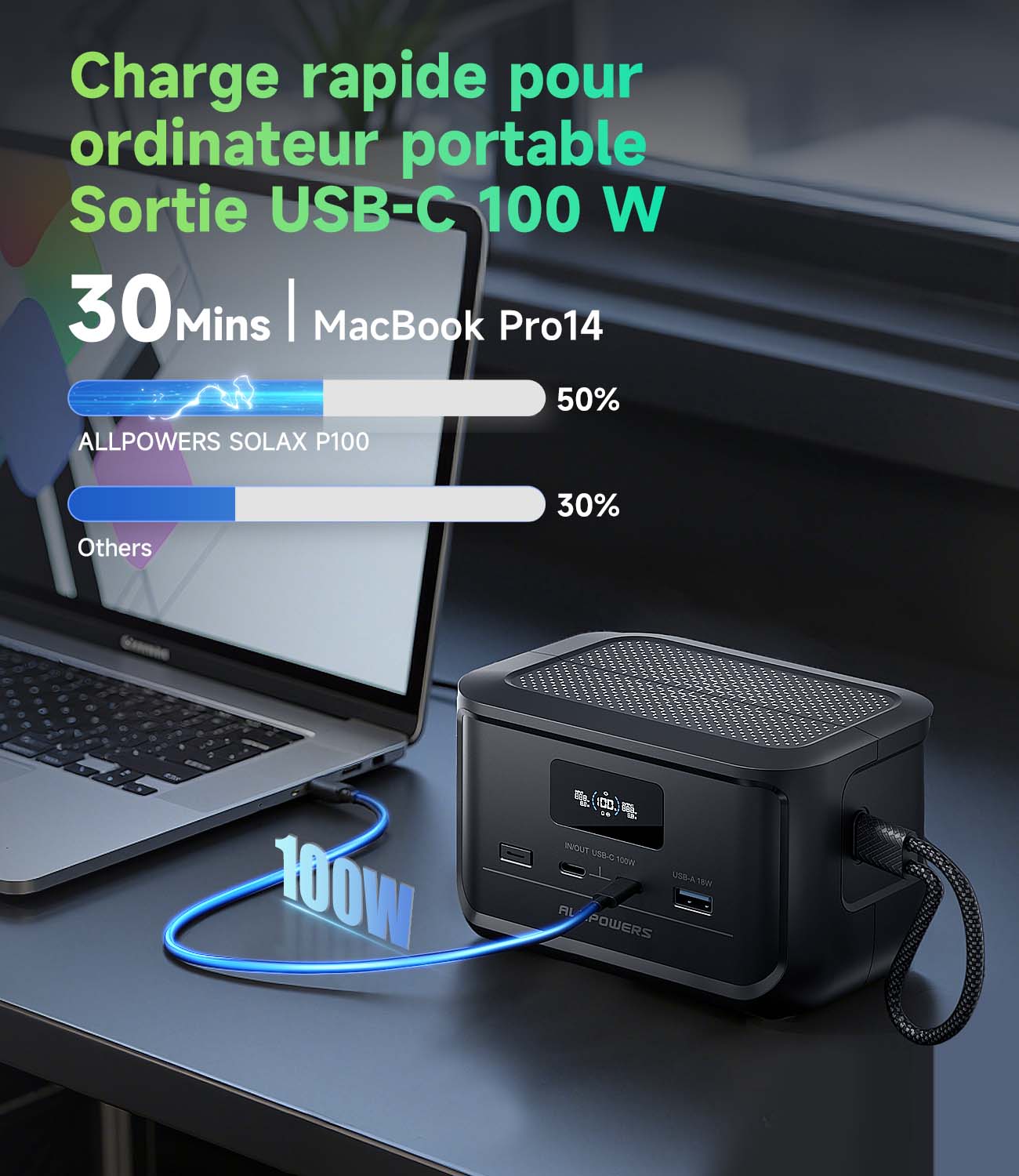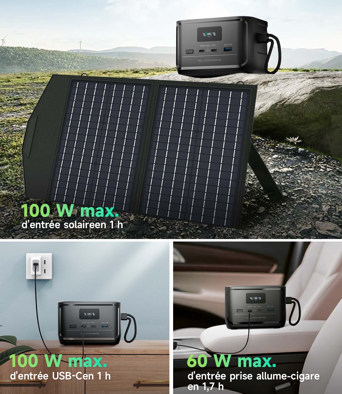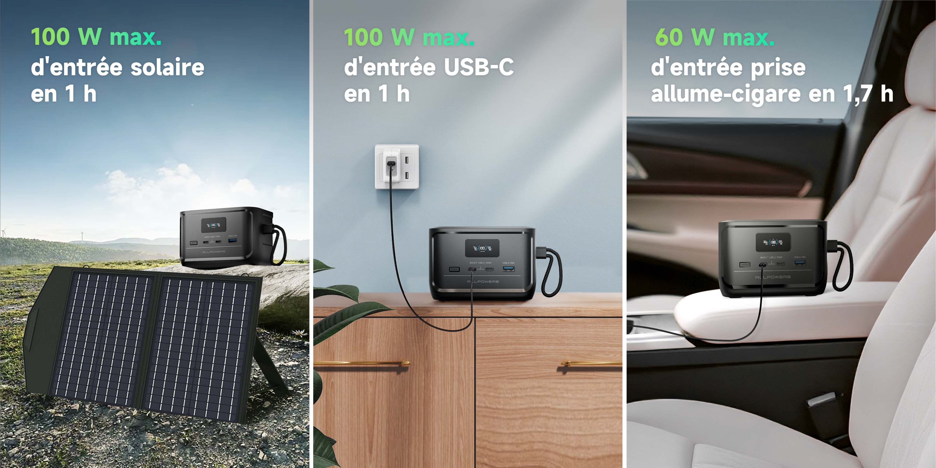 Ne vous souciez plus des batteries faibles ! L'ALLPOWERS SOLAX P100 combine trois méthodes de charge ultra-rapides en un seul appareil compact, offrant une flexibilité inégalée pour les aventures en plein air, les urgences et l'utilisation quotidienne. Avec une puissance solaire maximale de 100 W, rechargez vos appareils en seulement 1 heure : idéal pour le camping, la randonnée ou la vie autonome. Le port USB-C de 100 W assure une charge complète en seulement 1 heure, vous permettant de rester productif en déplacement. Branchez-le sur une prise allume-cigare 12 V/24 V et obtenez une charge maximale de 60 W, chargeant complètement vos appareils en 1,7 heure : idéal pour les longs trajets et les urgences.