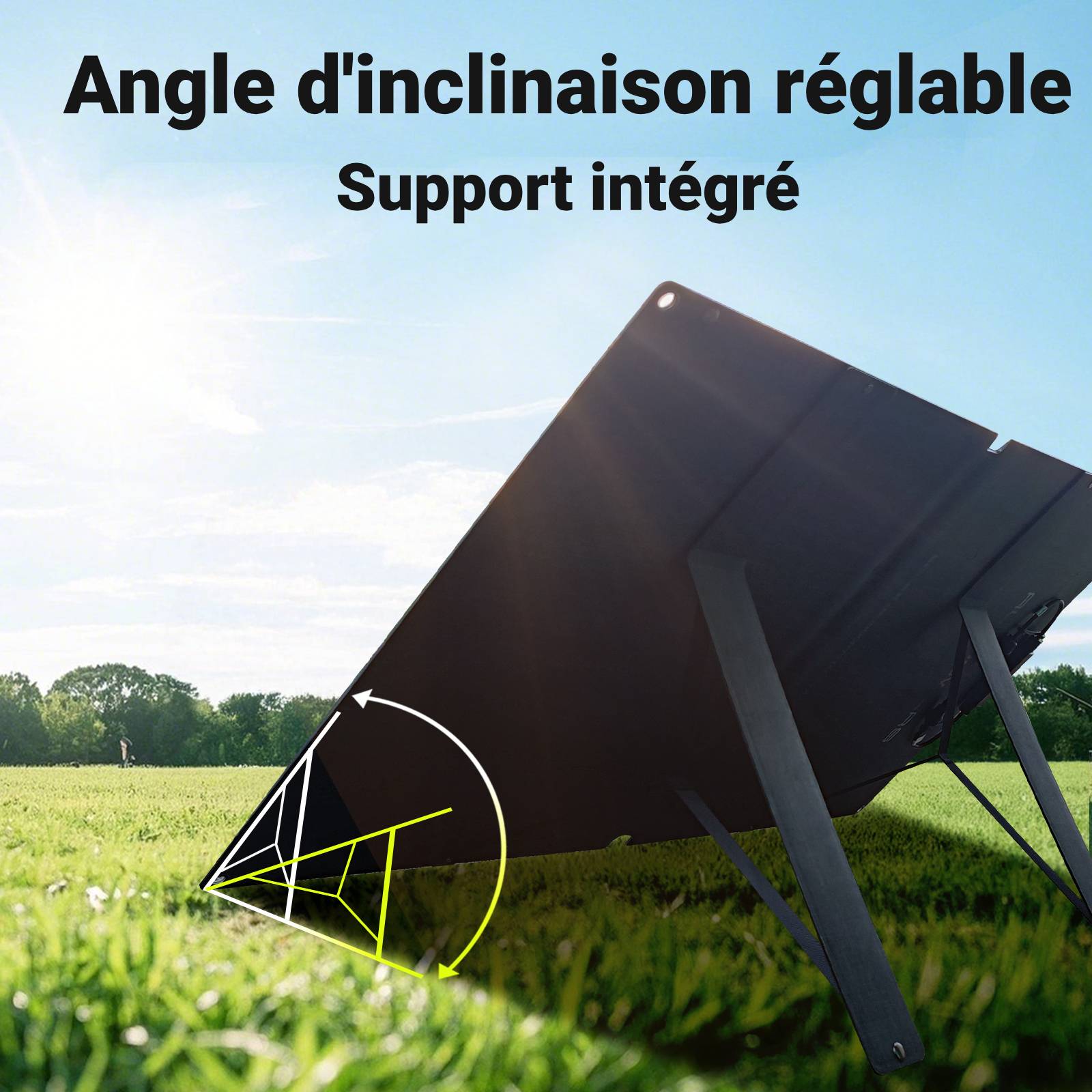 Le support arrière est doté d'une fonction de réglage flexible. Vous pouvez ajuster l'angle du panneau solaire en fonction des conditions météorologiques et de l'angle d'ensoleillement afin d'optimiser le taux de conversion photoélectrique. De plus, le panneau solaire ne doit pas être plié ni heurté violemment. Veuillez l'utiliser avec précaution afin d'éviter que des objets pointus n'endommagent la couche d'encapsulation en ETFE et ne réduisent la transmittance.