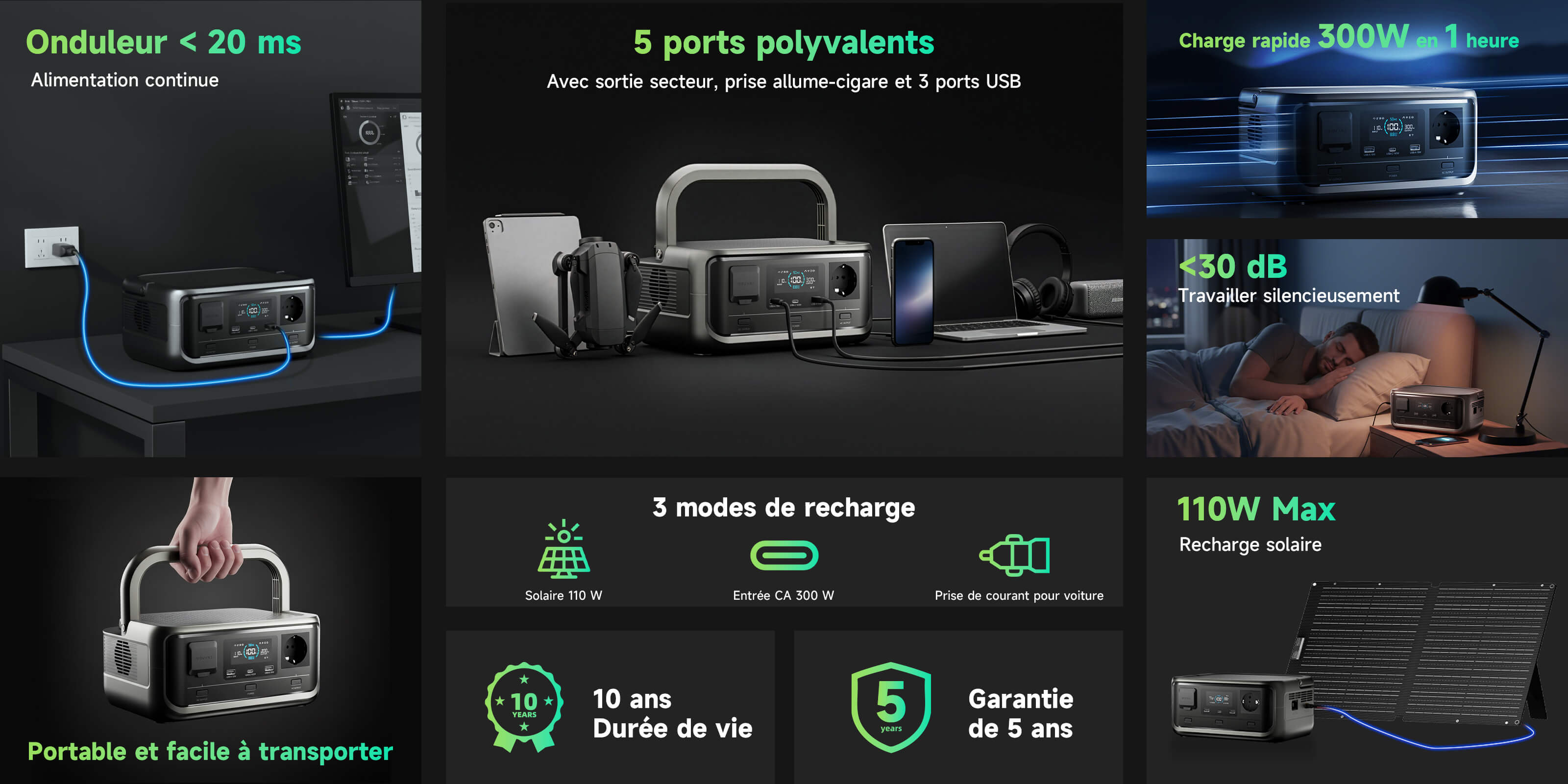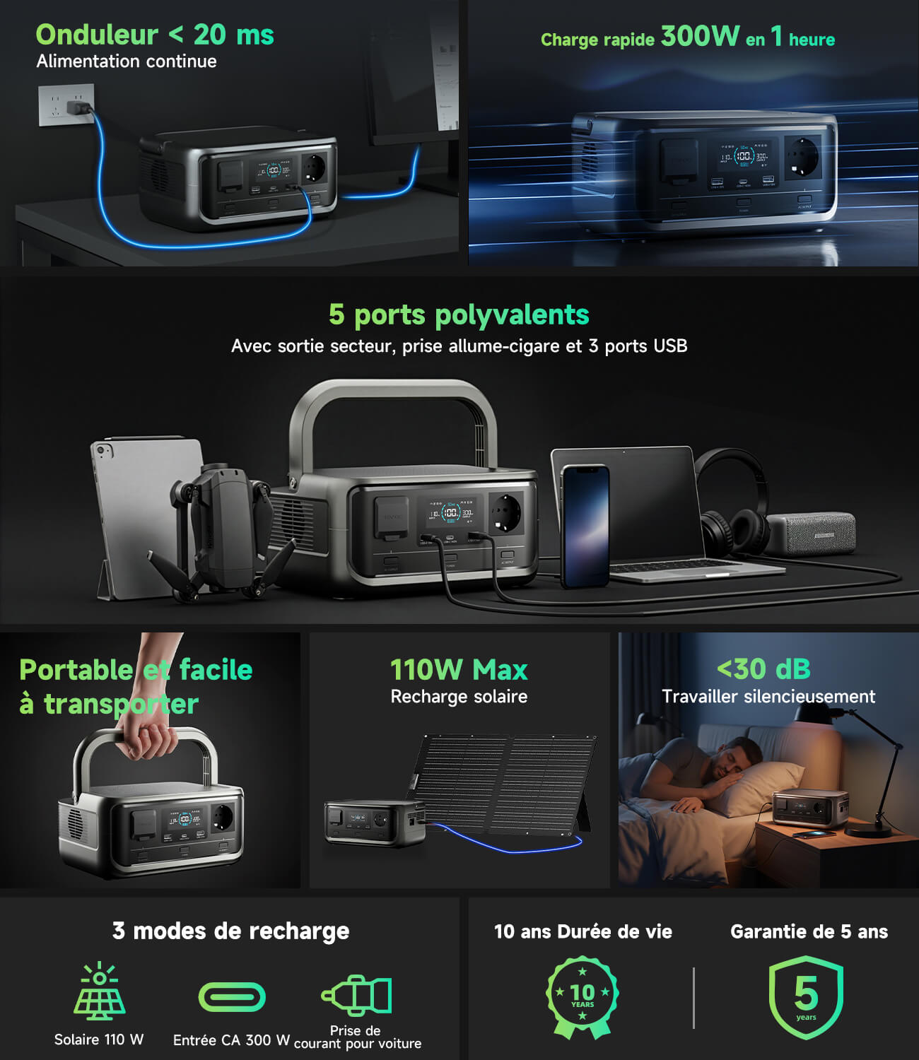 - Charge rapide : Entrée CA maximale de 300 W, de 0 à 100 % en 1 heure ;