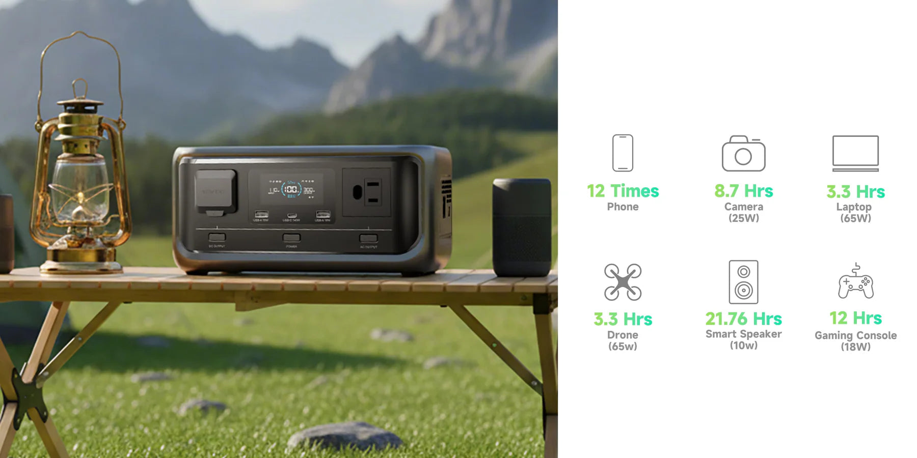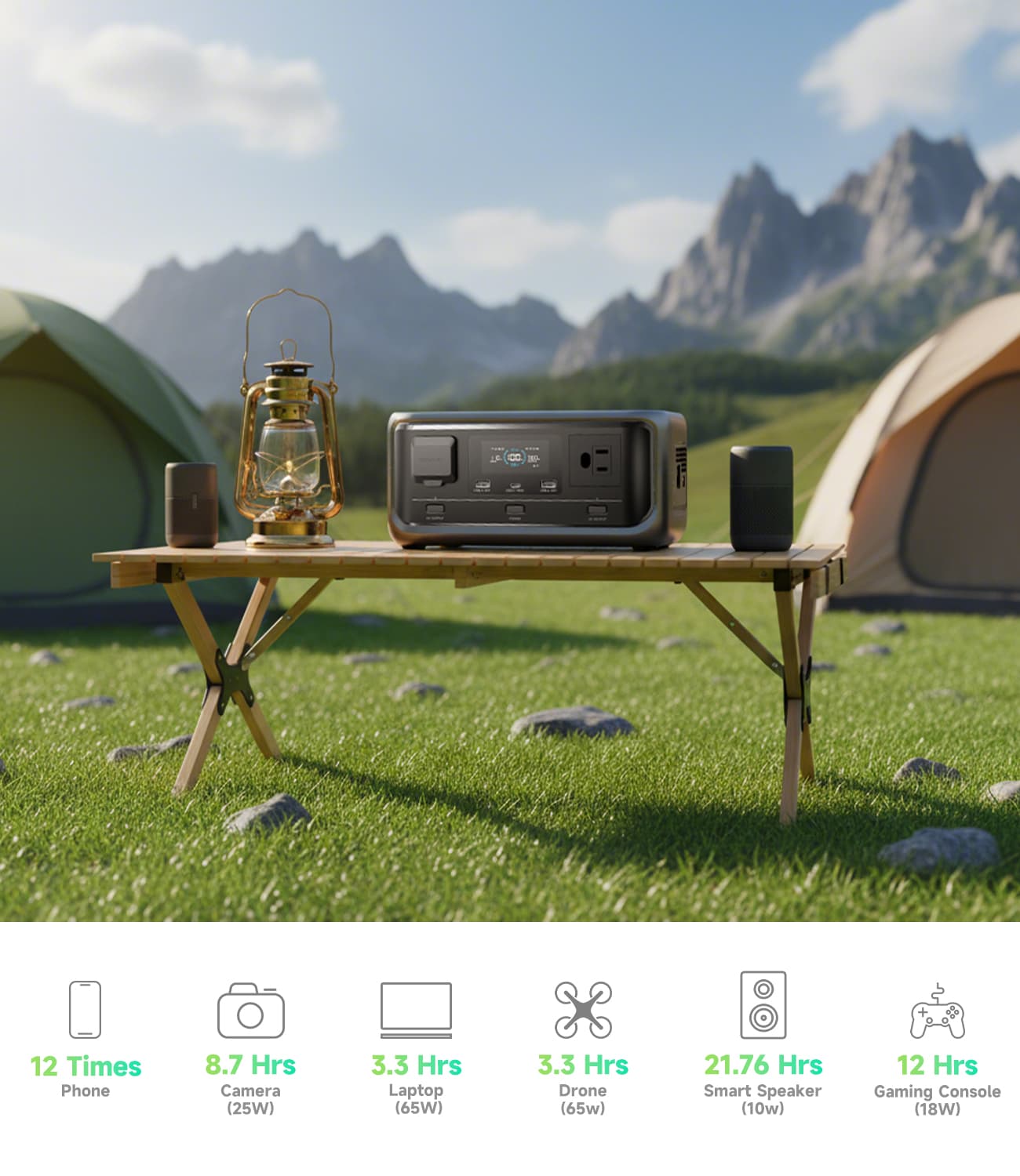 - Grande capacité et puissance élevée : avec une capacité de 256 Wh et une prise CA à onde sinusoïdale pure de 300 W (600 W en crête) ;