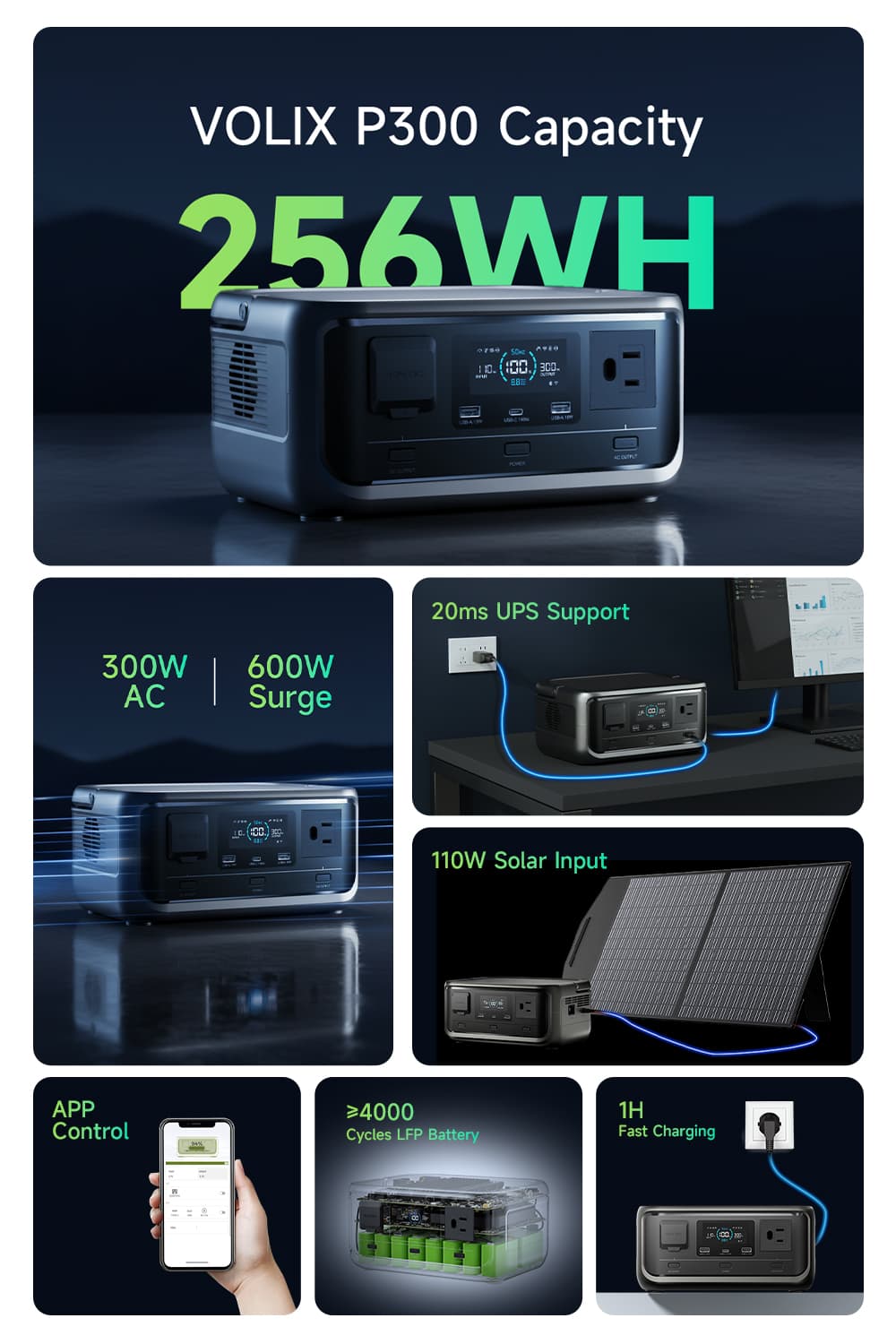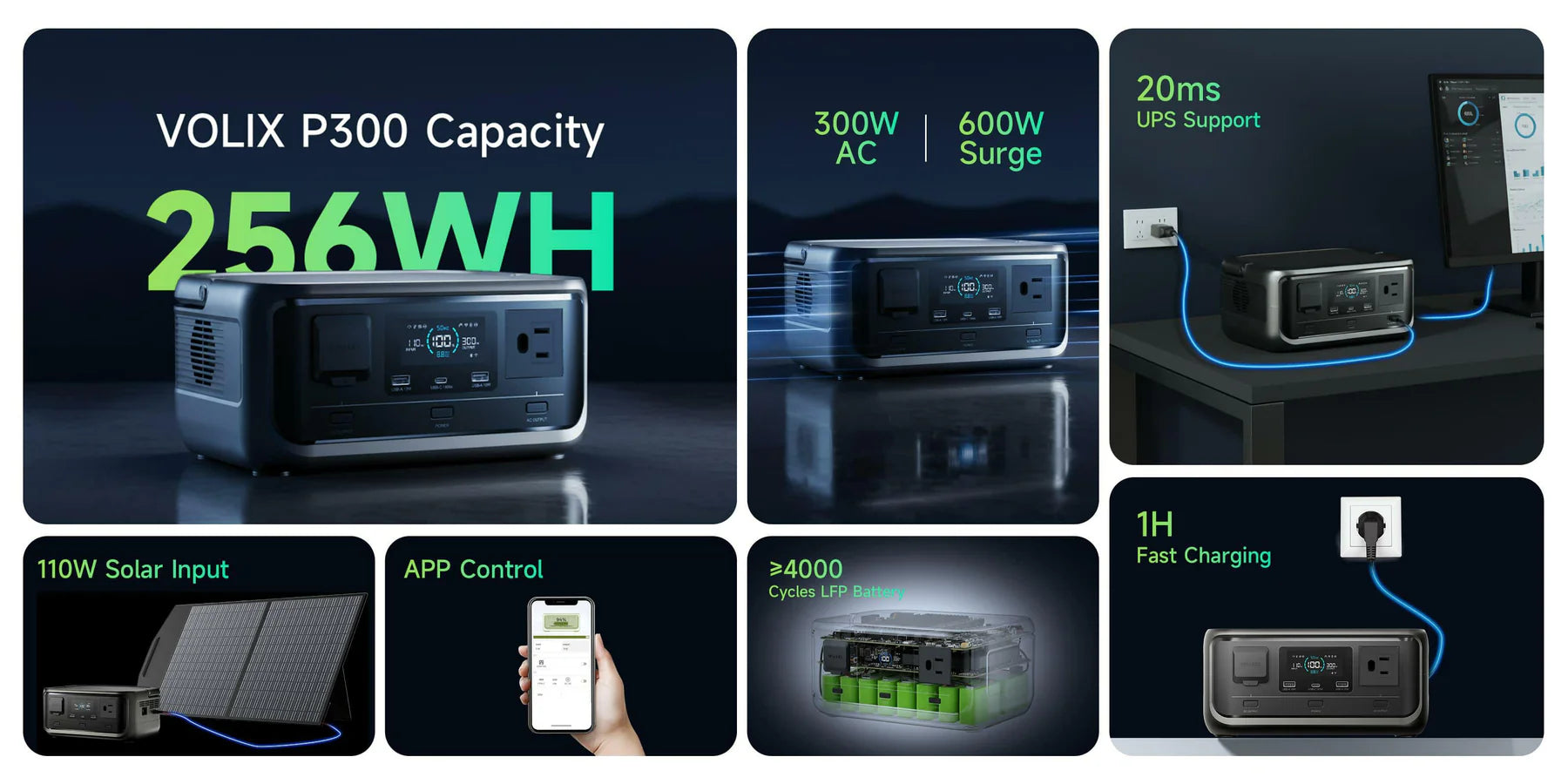 VOLIX P300 Libérez 300W de puissance AC pure sinusoidale et une puissance massive de 256Wh. Avec 5 sorties polyvalentes, il charge simultanément votre ordinateur portable, votre drone, votre appareil photo, votre mini-refroidisseur et votre téléphone. Idéal pour les voyages de camping, les urgences à la maison et les espaces de travail mobiles. Votre solution électrique tout-en-un.