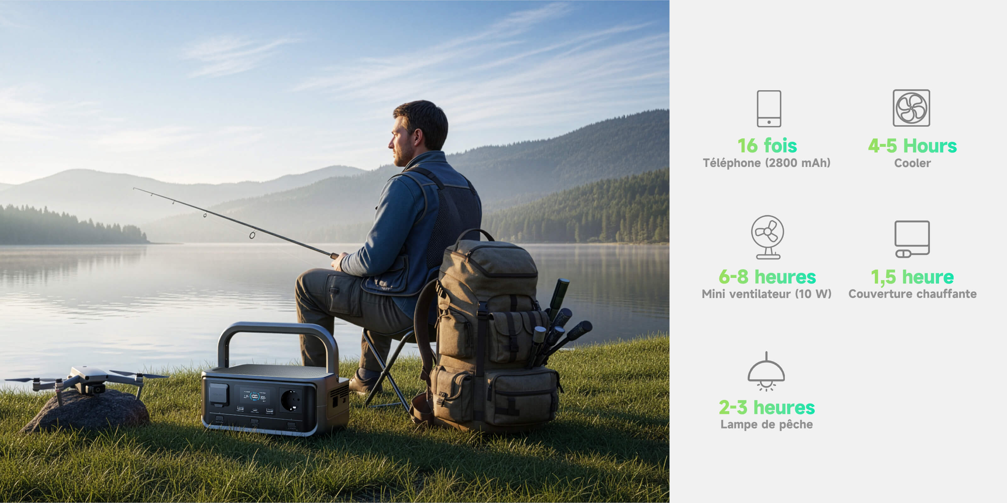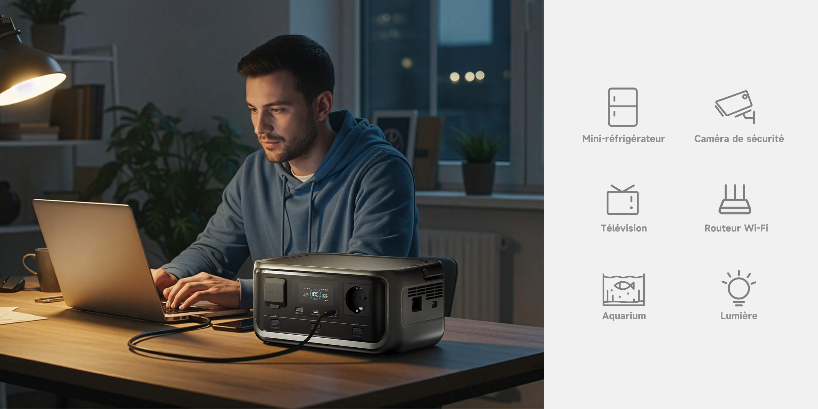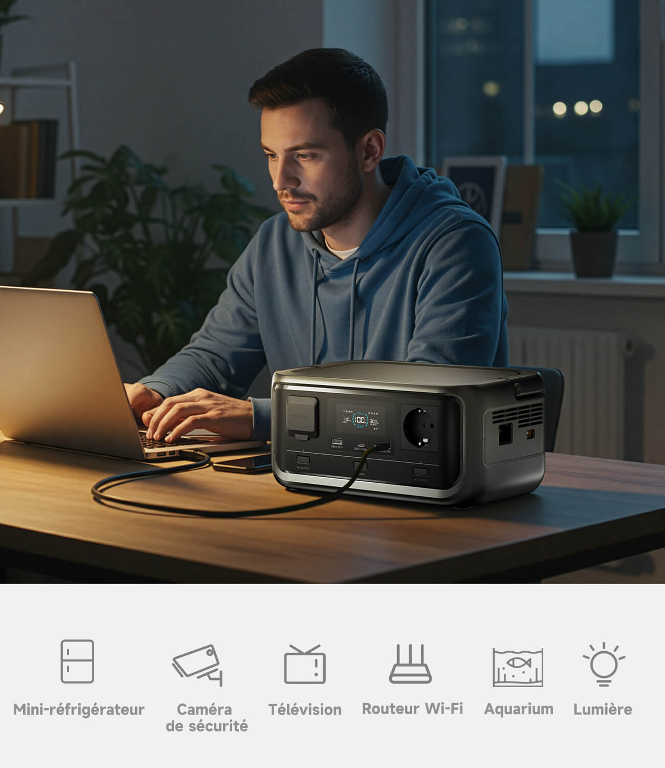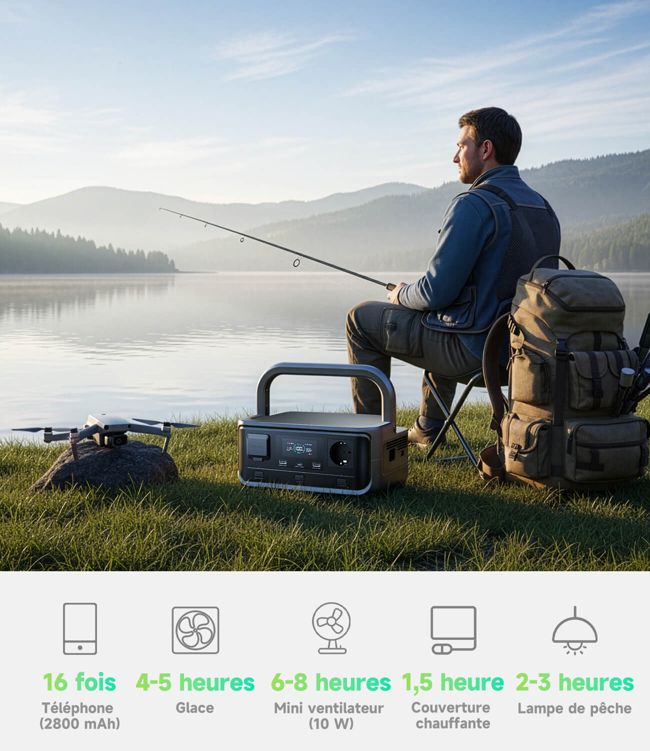 - Grande capacité et puissance élevée : avec une capacité de 256 Wh et une prise CA à onde sinusoïdale pure de 300 W (600 W en crête) ;