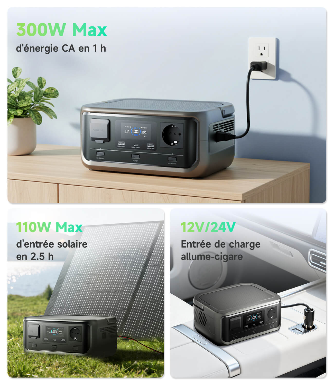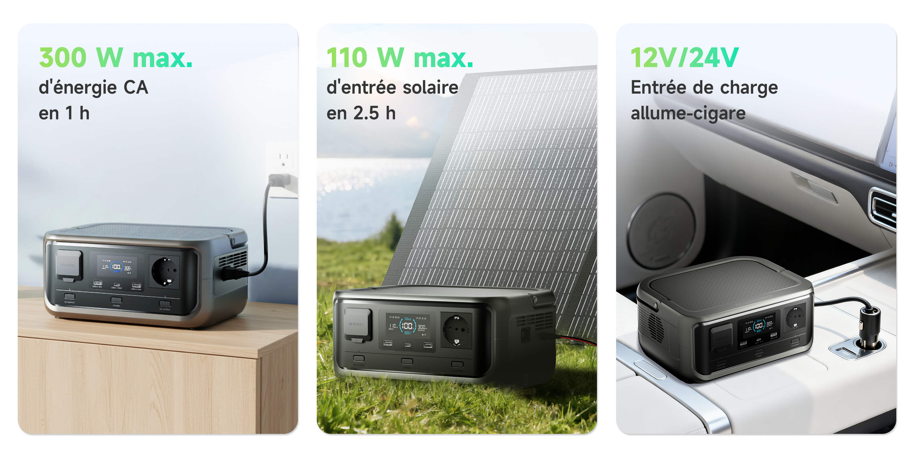 - Charge rapide : Entrée CA maximale de 300 W, de 0 à 100 % en 1 heure ;