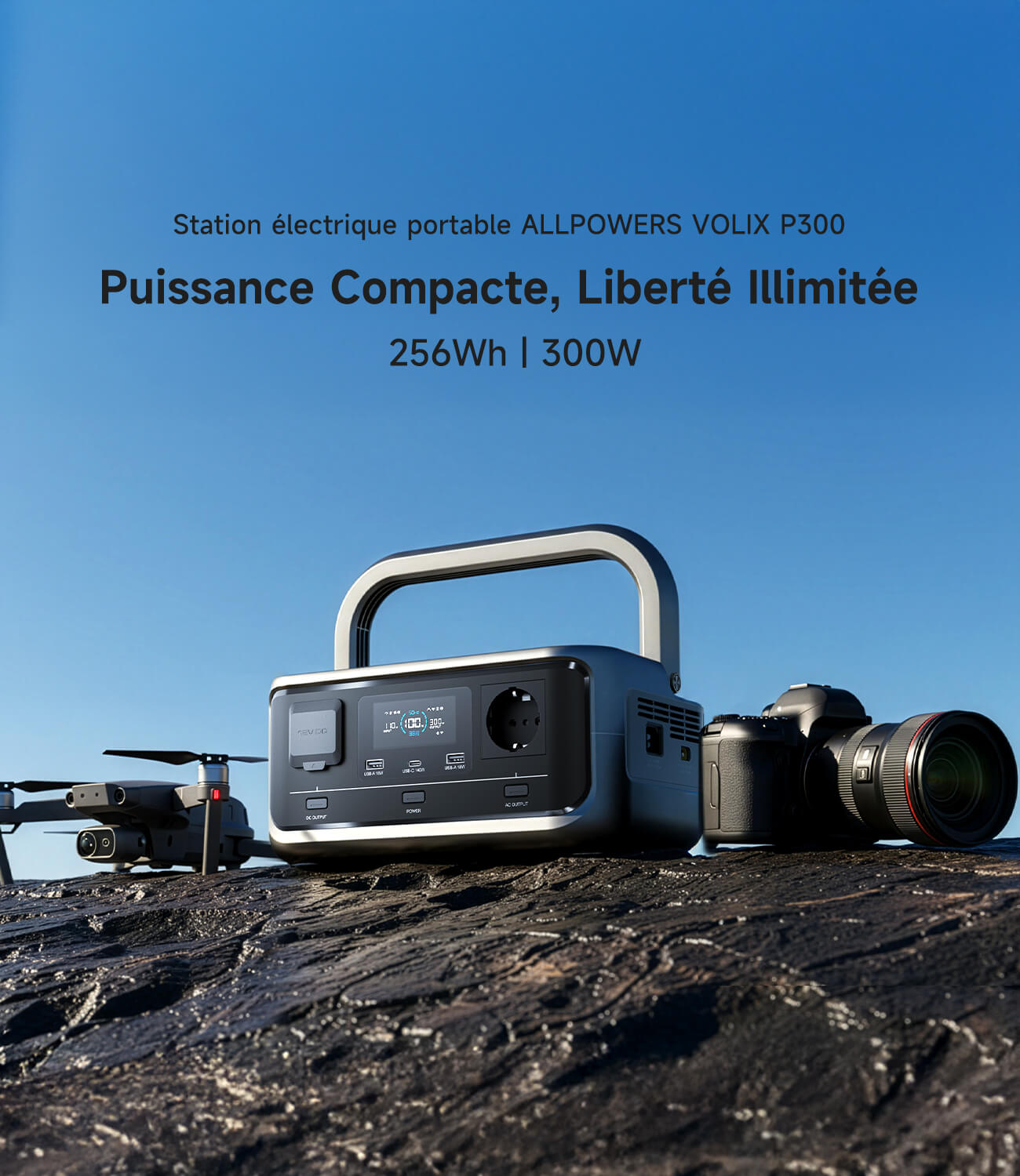 VOLIX P300 Libérez 300W de puissance AC pure sinusoidale et une puissance massive de 256Wh. Avec 5 sorties polyvalentes, il charge simultanément votre ordinateur portable, votre drone, votre appareil photo, votre mini-refroidisseur et votre téléphone. Idéal pour les voyages de camping, les urgences à la maison et les espaces de travail mobiles. Votre solution électrique tout-en-un.